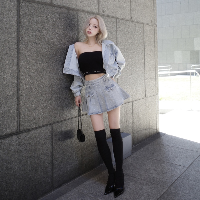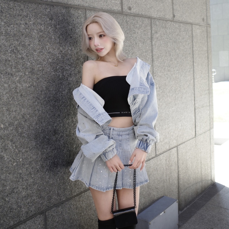 全体に散りばめられたビジューが繊細に輝き、カジュアルなデニム素材を一気に華やかな印象へと昇華したセットアップ💎✨ 程よくルーズなジャケット×プリーツミニスカートのバランスで、羽織るだけで自然とスタイルアップが叶います👗💙 胸元のDDロゴパーツやインナーパンツ付きスカートなど、デザイン性と着やすさを兼ね備えた万能アイテムです♡💫