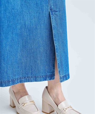タイト過ぎないストレートシルエットで、大人のラフ感を演出するデニムスカート。
