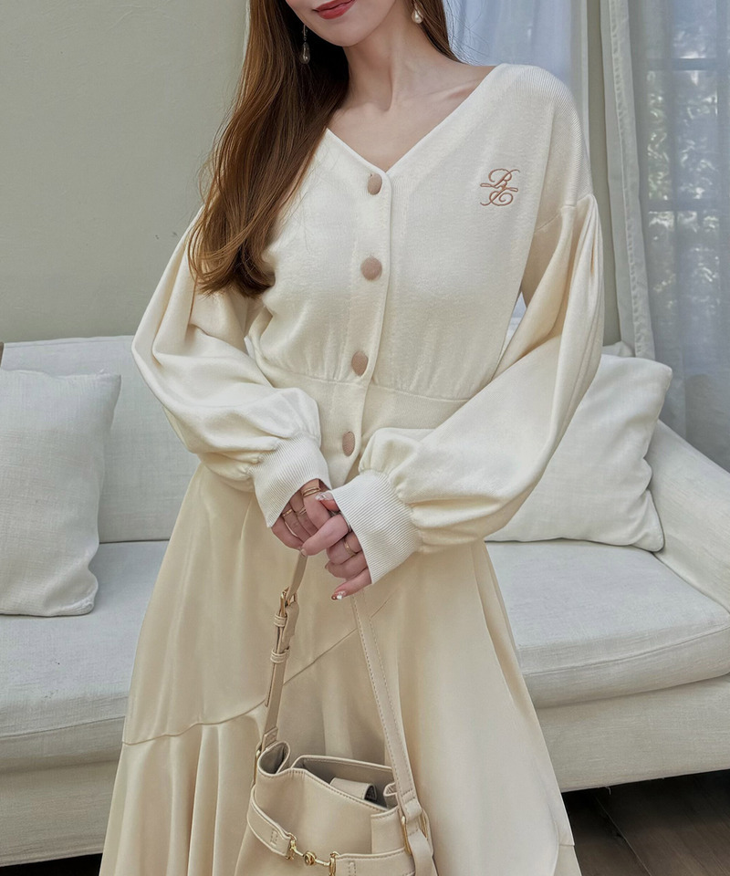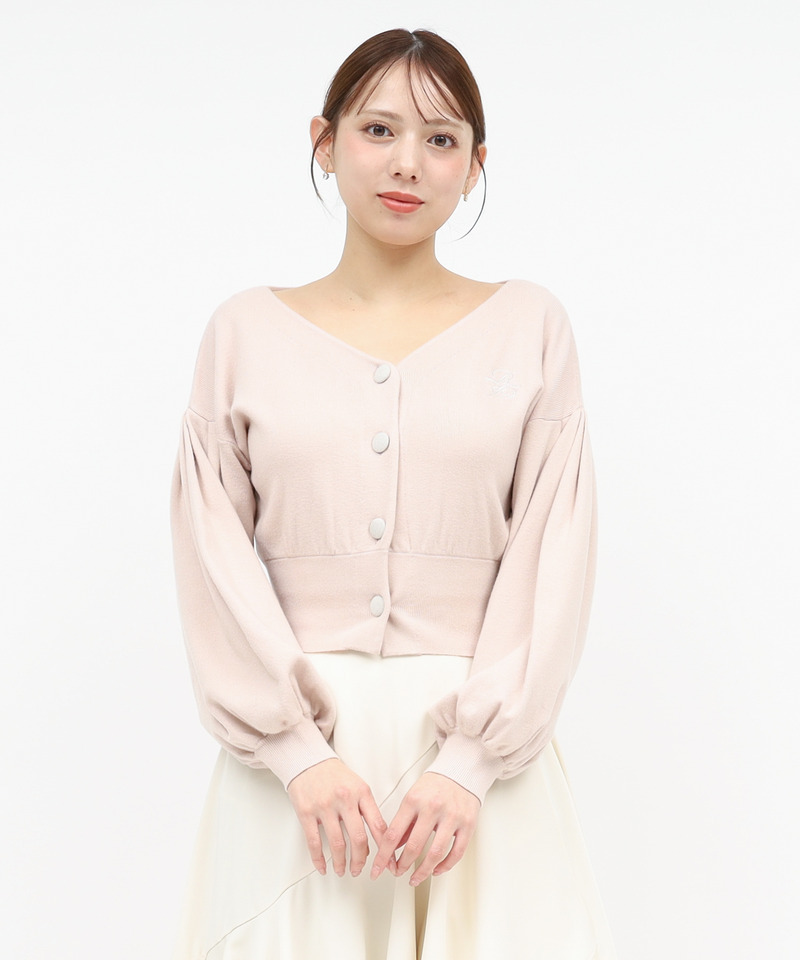 胸元に施されたオリジナルロゴ刺しゅうや配色くるみ釦がアクセントとなり目を惹くカーデトップス。