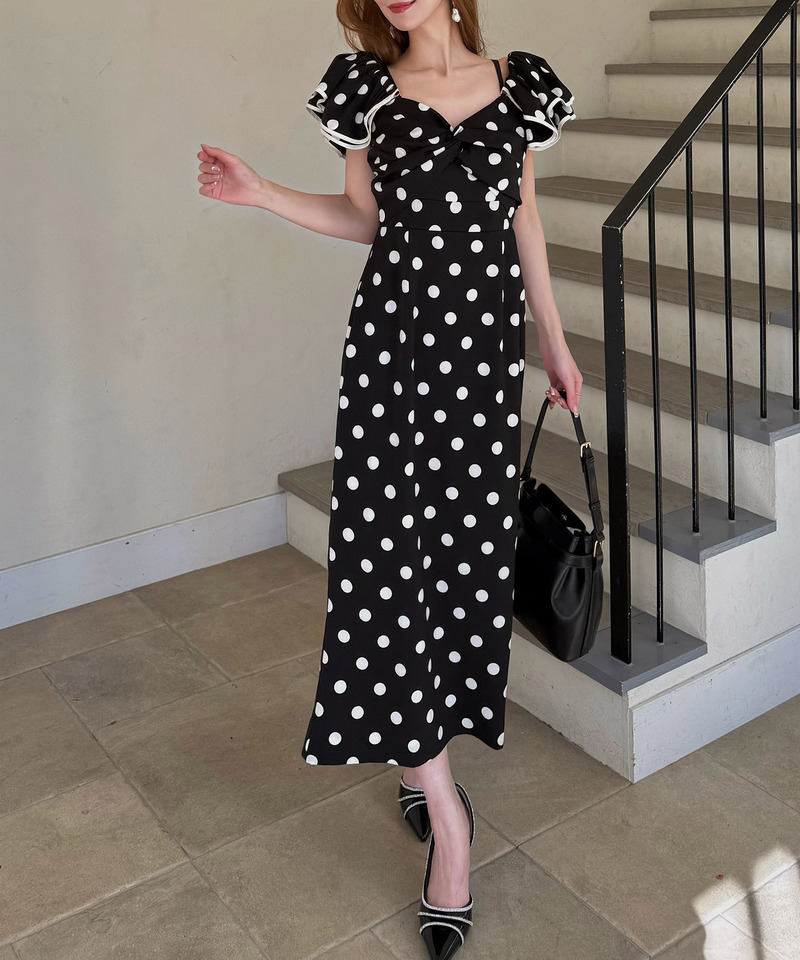 存在感抜群のドット柄が目を惹くレディムード溢れるロングワンピース。
