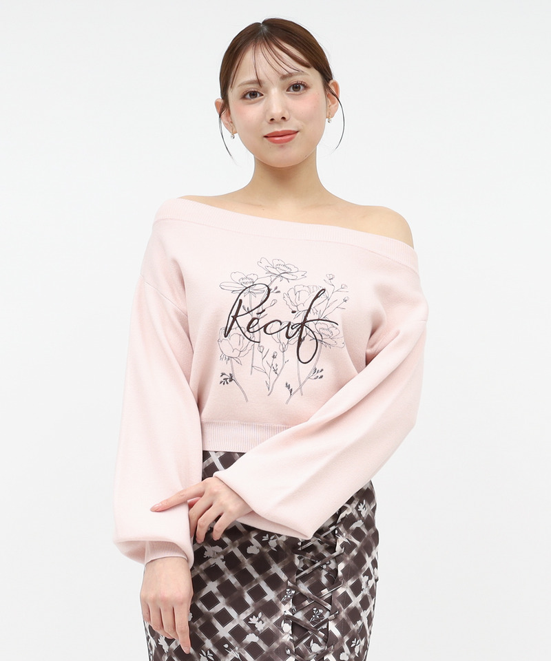フロントに施された配色ロゴ刺しゅう×フラワープリントが目を惹く存在感溢れるニットトップス。
