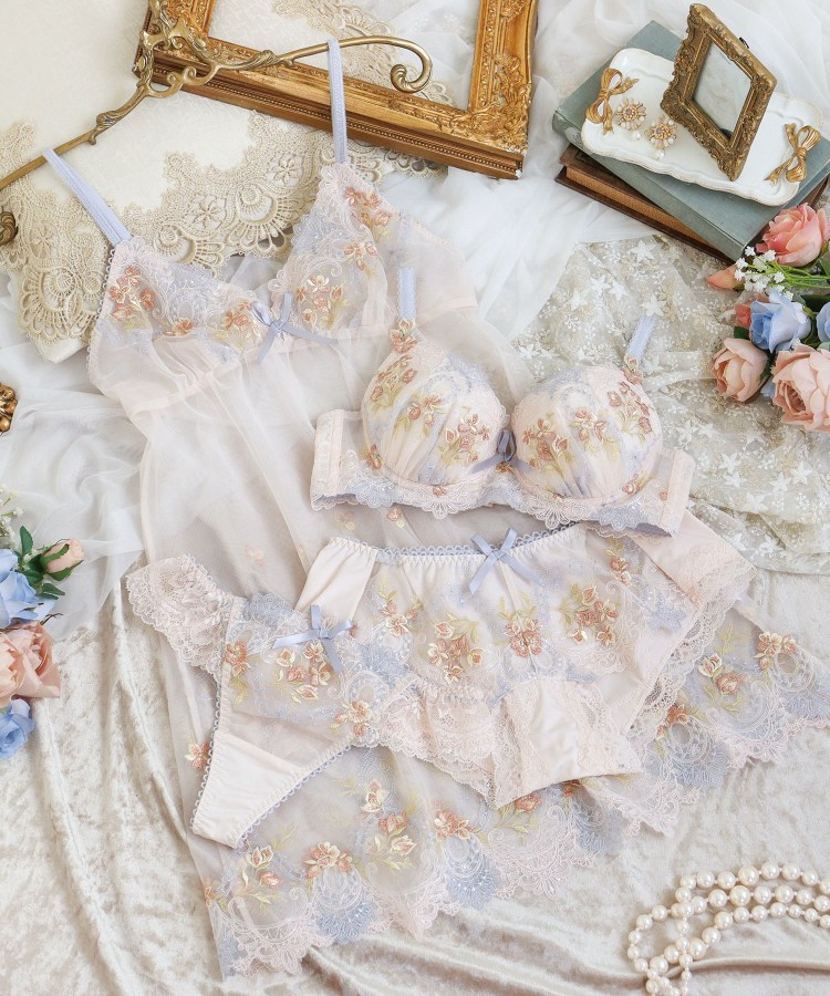 大人気を博した「アリーシャ」が、新しいカラーを加えてリバイバル。イングリッシュローズが咲きほこる、歴史あるヨーロッパのお城をイメージしたシリーズです。建物の優美な装飾を表現したレースは、繊細な幾何学模様の曲線を全体にあしらい、女性らしくも印象的なデザインに。配色は交互にすることで、思わず目をひく華やかさを演出します。カップにはお庭に咲くイングリッシュローズを散りばめ、きらめくラメ糸で豪華に仕上げました。その周りにはメインのお花を引き立てる手描き風のラフなステッチで、お花や曲線のモチーフをほどこして奥行き感をプラス。ストラップにはお揃いのアップリケをあしらいました。気品高いエレガントなイメージを身にまとうような、特別感あふれるコレクションです。