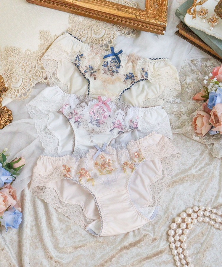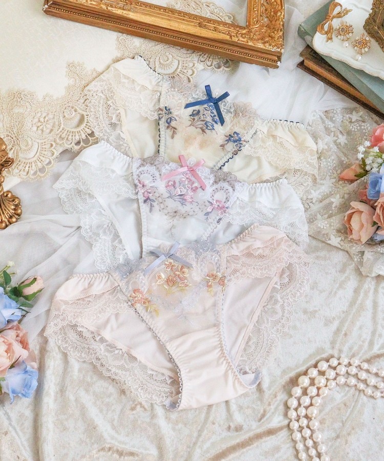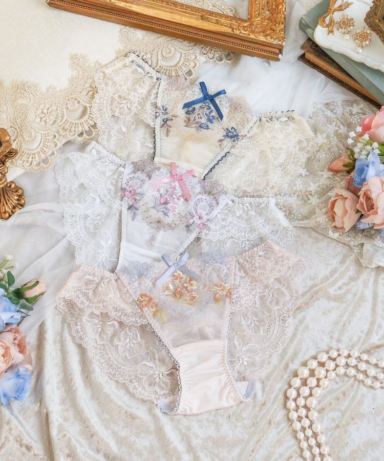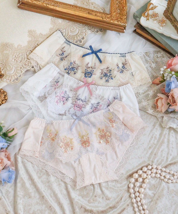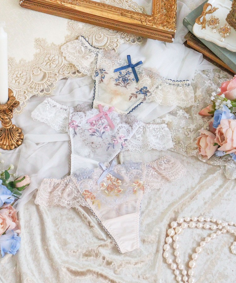大人気を博した「アリーシャ」が、新しいカラーを加えてリバイバル。イングリッシュローズが咲きほこる、歴史あるヨーロッパのお城をイメージしたシリーズです。建物の優美な装飾を表現したフロントレースは、繊細な幾何学模様の曲線を全体にあしらい、女性らしくも印象的なデザインに。配色は交互にすることで、思わず目をひく華やかさを演出します。中央にはお庭に咲くイングリッシュローズを散りばめ、きらめくラメ糸で豪華に仕上げました。その周りにはメインのお花を引き立てる手描き風のラフなステッチで、お花や曲線のモチーフをほどこして奥行き感をプラス。バックスタイルにはお揃いのアップリケをあしらいました。気品高いエレガントなイメージを身にまとうような、特別感あふれるコレクションです。