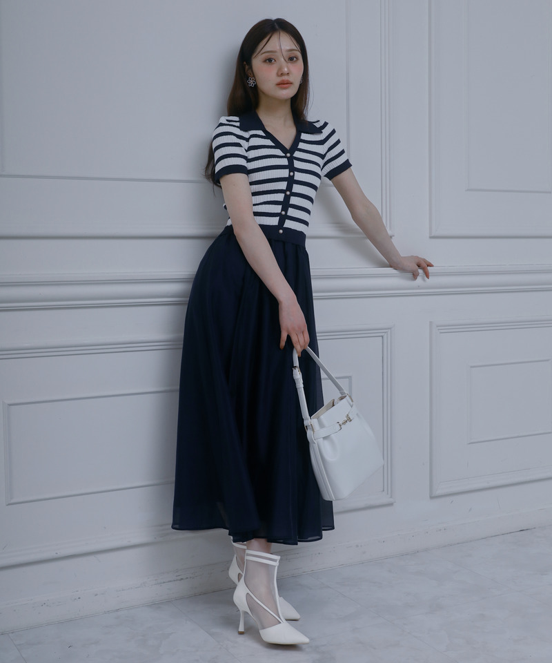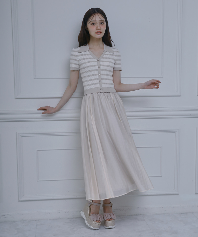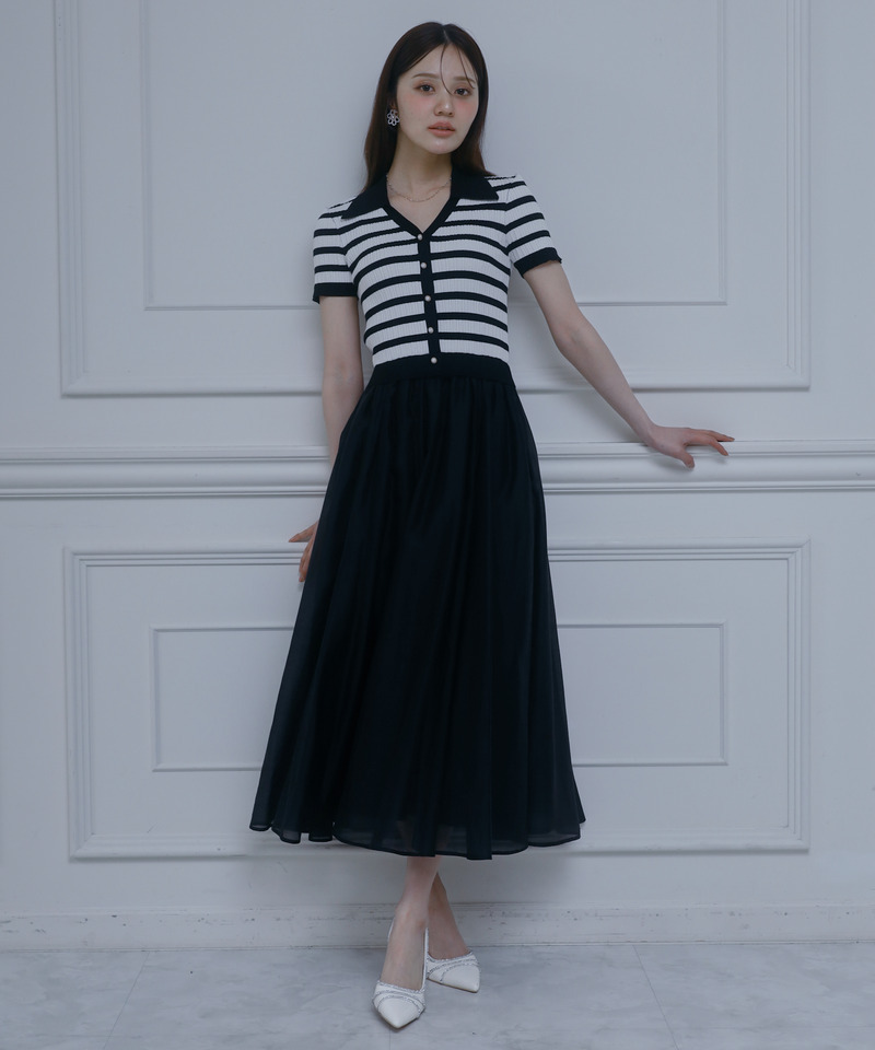 存在感抜群の襟付ボーダーニット×上品な光沢感が魅力のシアースカートの異素材ドッキングワンピース。