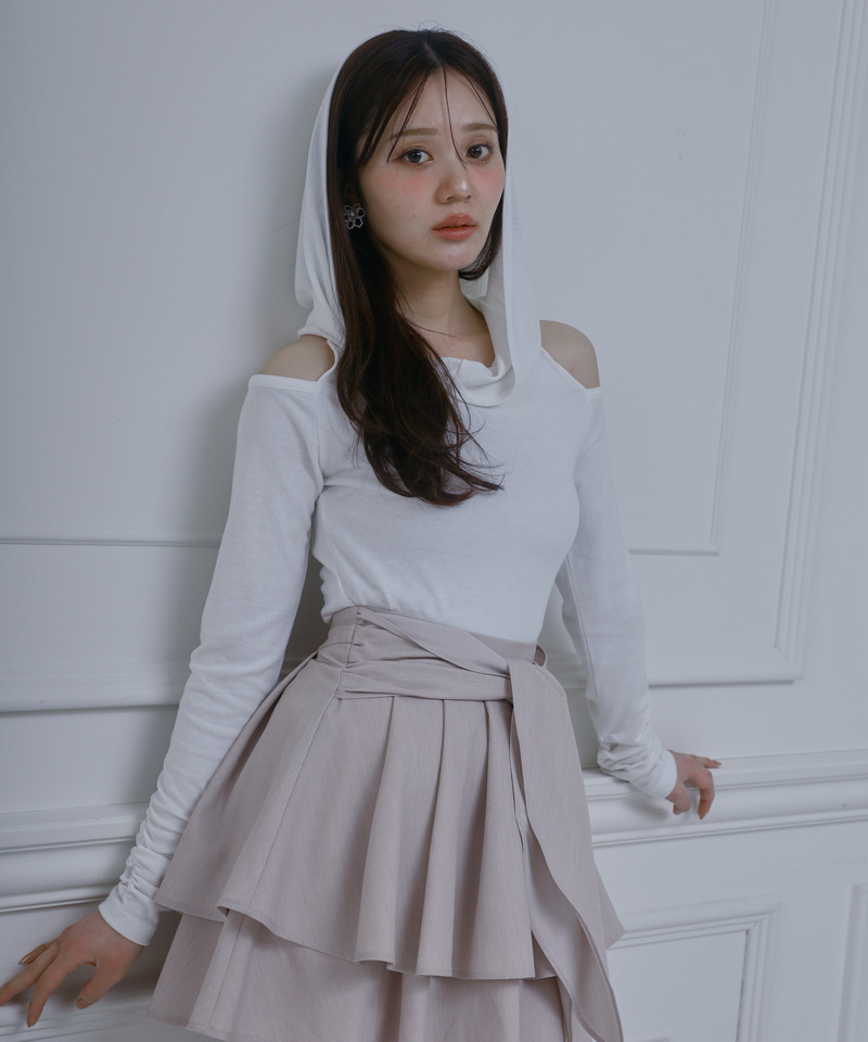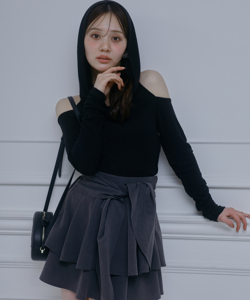 柔らかなカット素材を使用した、オフショルダーとフーディをドッキングしたデザイントップス。