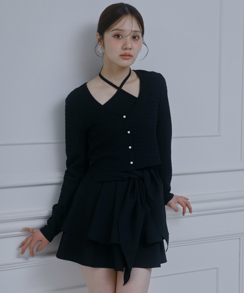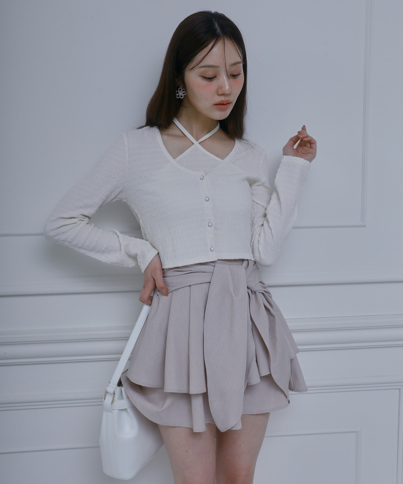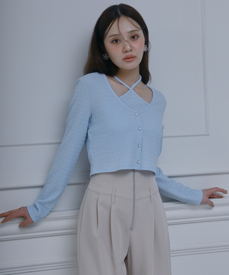 ぽこぽことした表面感のある生地で仕上げたVネックカーディガン×ホルターネックキャミのアンサンブル。