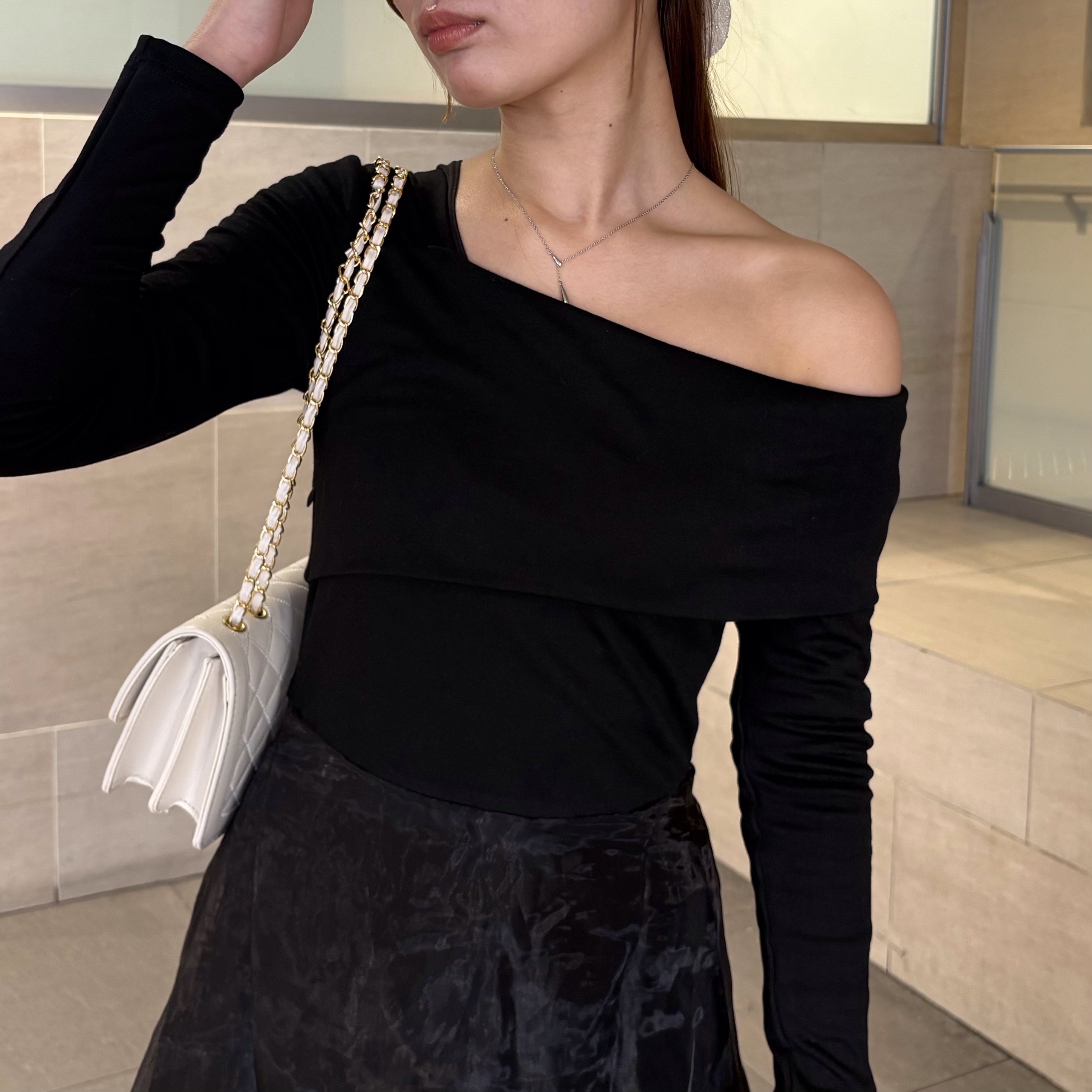 ワンショルデザインが女性らしく、スッキリ見え✨
