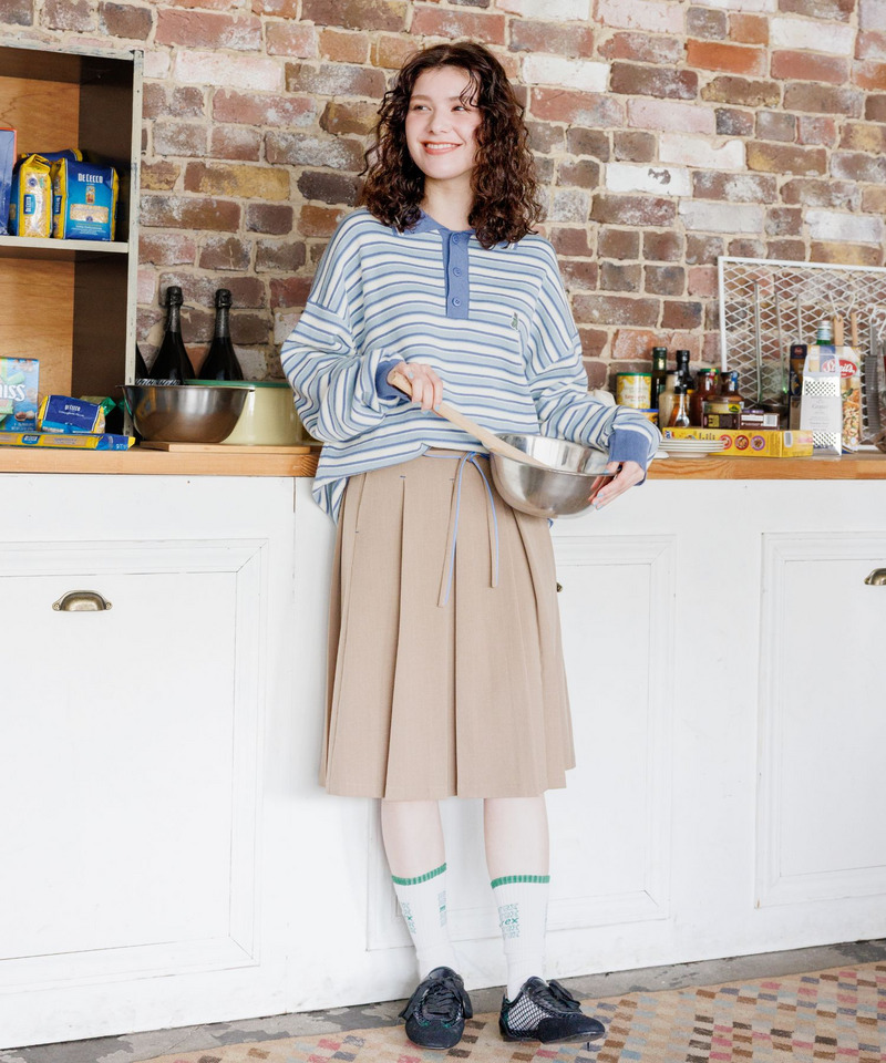 スポーティなイメージの配色パイピングリボン・カンヌキステッチが特徴的なボックスプリーツスカートです!