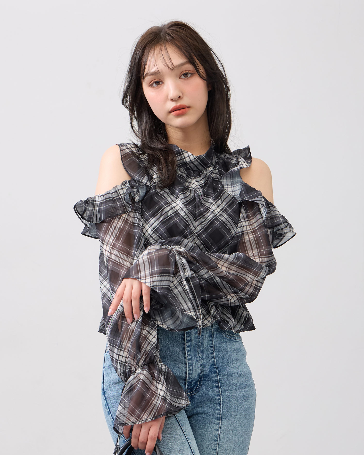 オープンショルダーでヘルシーな肌見せが叶うブラウスです☁️