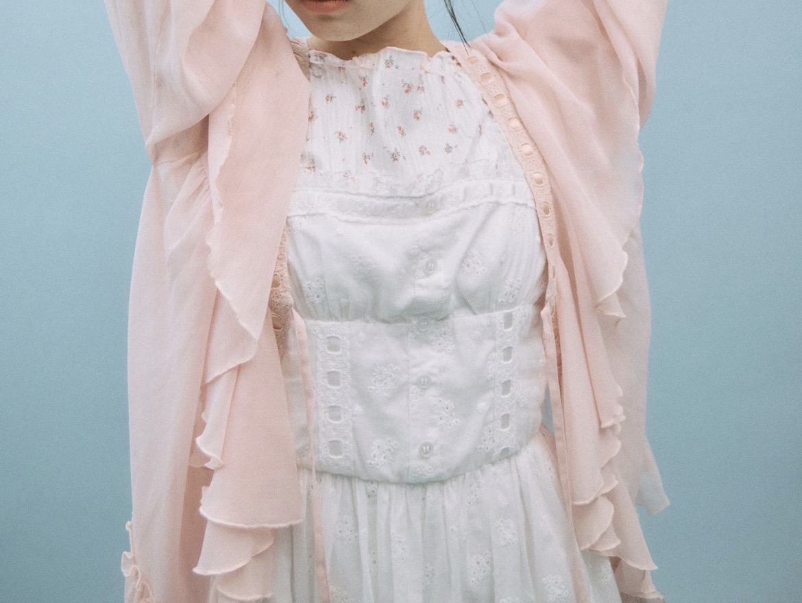 はしごレースやサテンリボンを通したディテールが、リメイクのようなやさしい表情を添えています。
