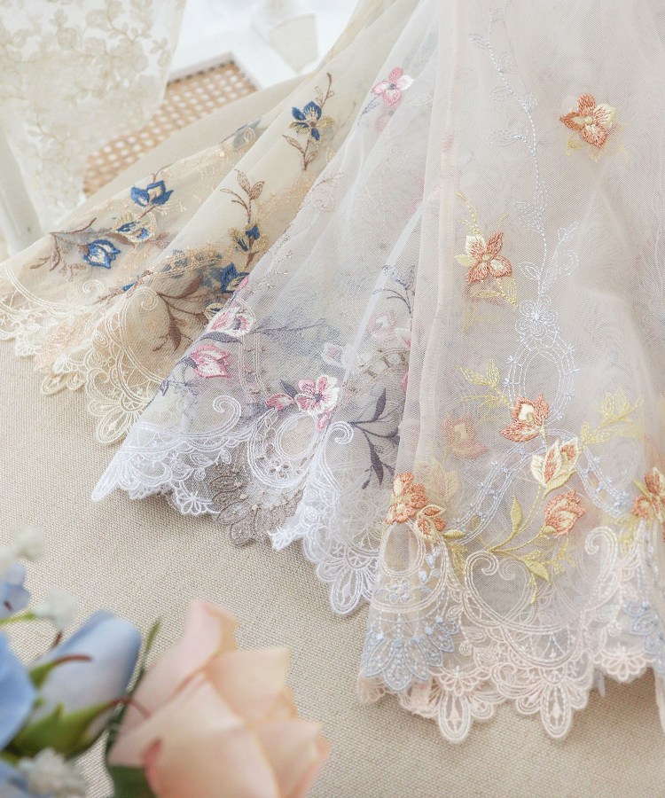 大人気を博した「アリーシャ」が、新しいカラーを加えてリバイバル。イングリッシュローズが咲きほこる、歴史あるヨーロッパのお城をイメージしたシリーズです。建物の優美な装飾を表現したレースは、繊細な幾何学模様の曲線を全体にあしらい、女性らしくも印象的なデザインに。配色は交互にすることで、思わず目をひく華やかさを演出します。カップにはお庭に咲くイングリッシュローズを散りばめ、きらめくラメ糸で豪華に仕上げました。その周りにはメインのお花を引き立てる手描き風のラフなステッチで、お花や曲線のモチーフをほどこして奥行き感をプラス。ストラップにはお揃いのアップリケをあしらいました。気品高いエレガントなイメージを身にまとうような、特別感あふれるコレクションです。