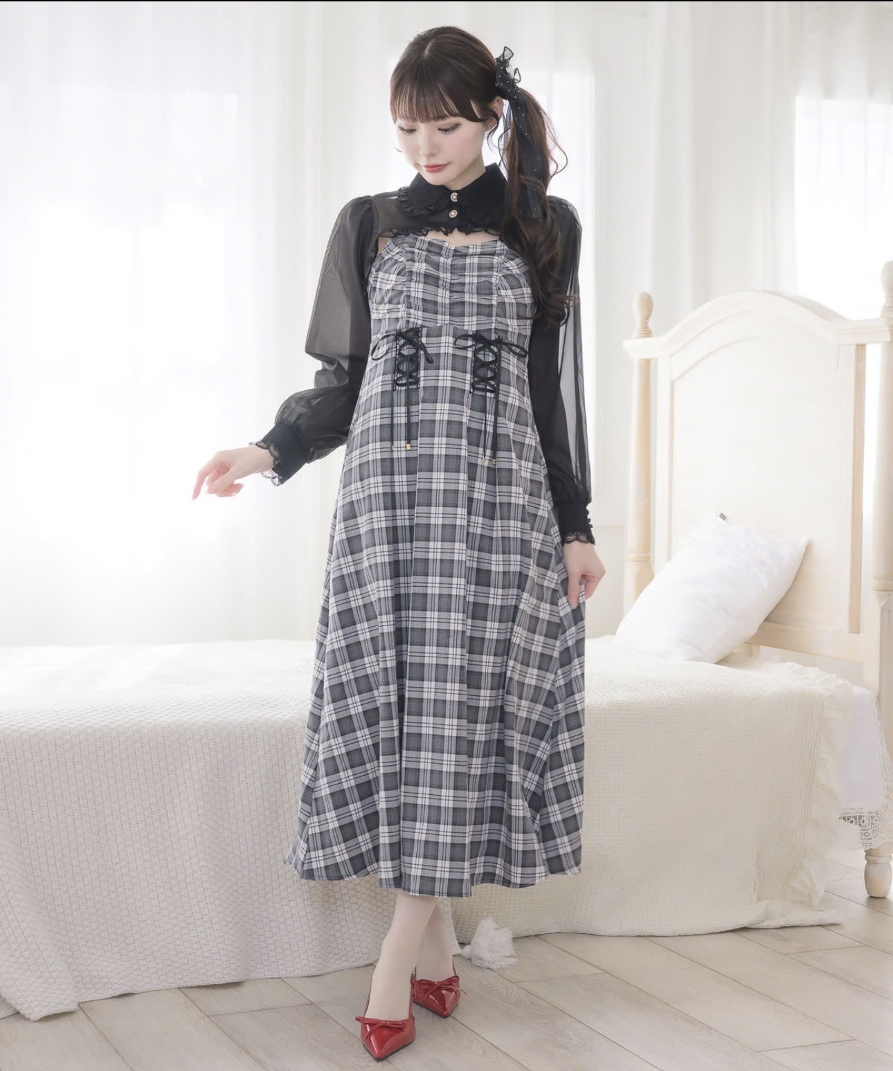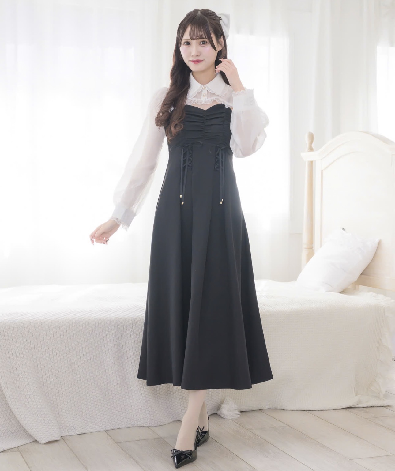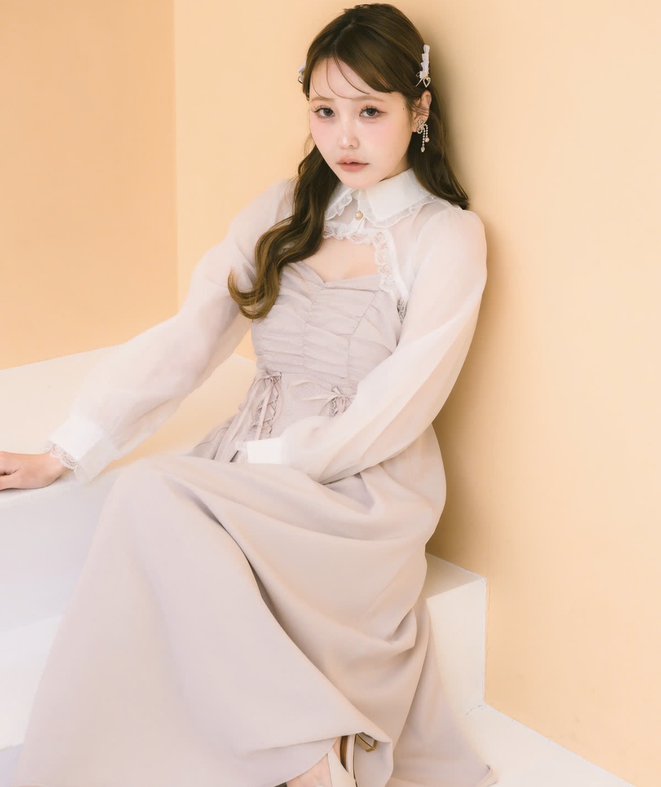 贅沢なロング丈が魅力のセットアイテム。コーディネートも即完成し、旬なスタイルをメイクしてくれます。ウエストのレースアップでシルエットをすっきりと◎シアーボレロがほどよく露出を抑え、バランスの取れた着こなしに♪