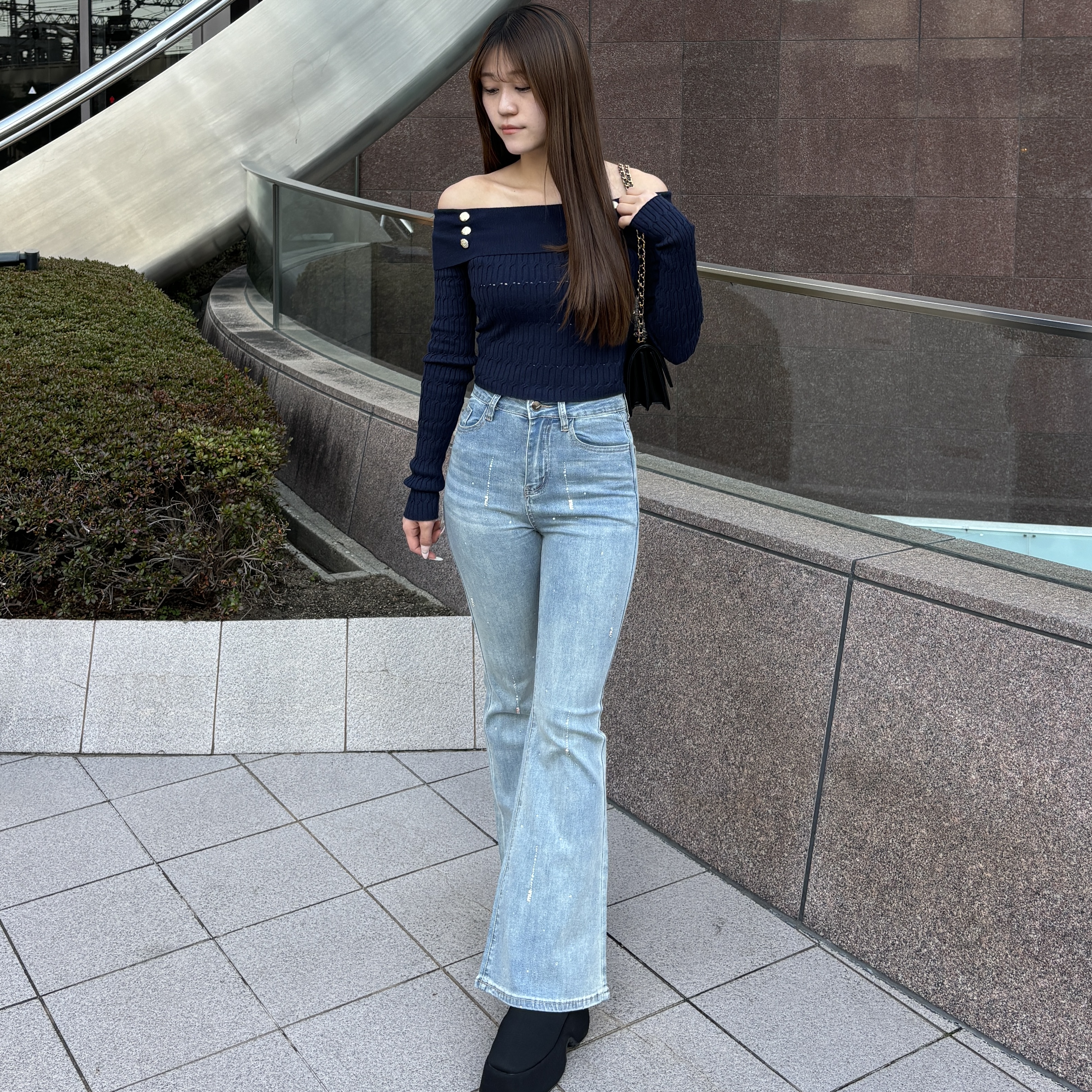 ゴールドボタンで上品見えするオフショルトップス👚✨️