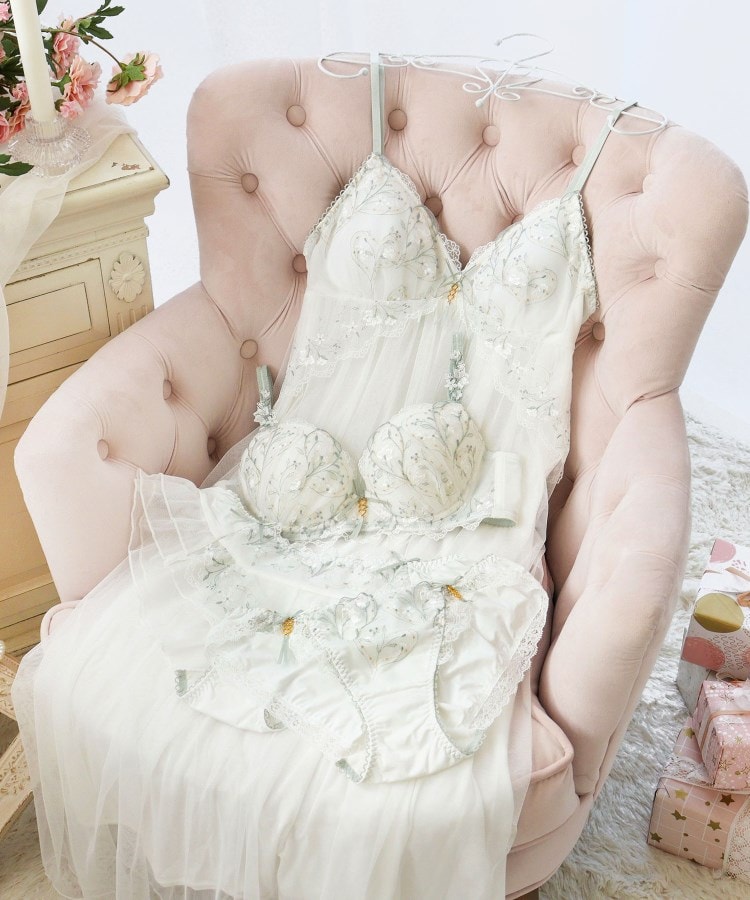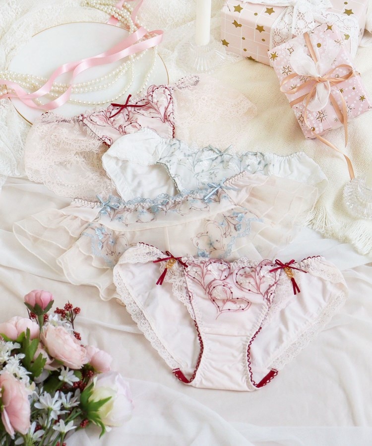 キラキラと輝く繊細な小花たちを散りばめたデザインとなっております。カップレースにはさりげなくハートデザインを刺繍して、バレンタインのエッセンスを少し取り入れた、上品で清楚な印象に。普通糸とラメ糸、厚みのあるウーリー糸を使用することで、大人っぽくも豪華な柄行きに仕上がりました。リボンにはタッセルをイメージした3連のハートチャームをあしらい、特別感を演出。ストラップにはペアのお花のアップリケをほどこして、細部まで心ときめくデザインをお楽しみいただけます。カラーはちょっぴり大人なスウィーツをイメージした、バレンタイン気分を盛り上げてくれるコレクションです。