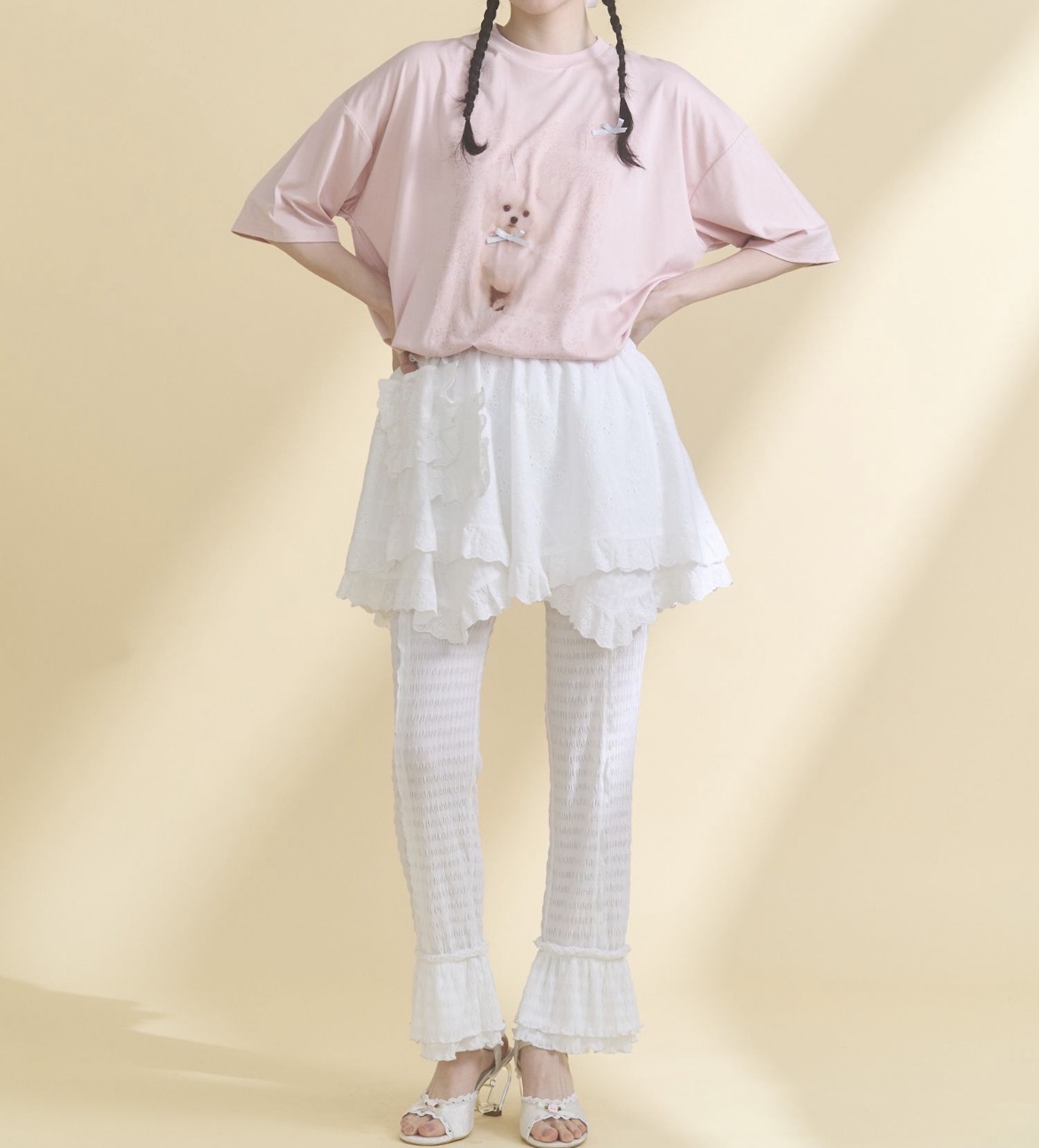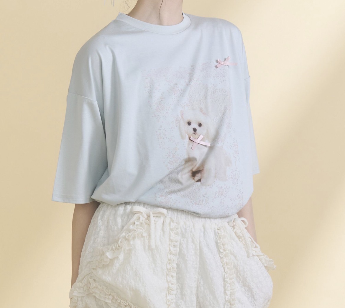 リボンでおめかししたわんちゃんを描いたプリントTシャツ。