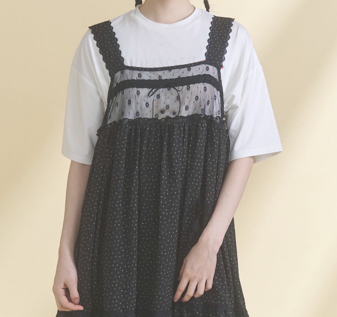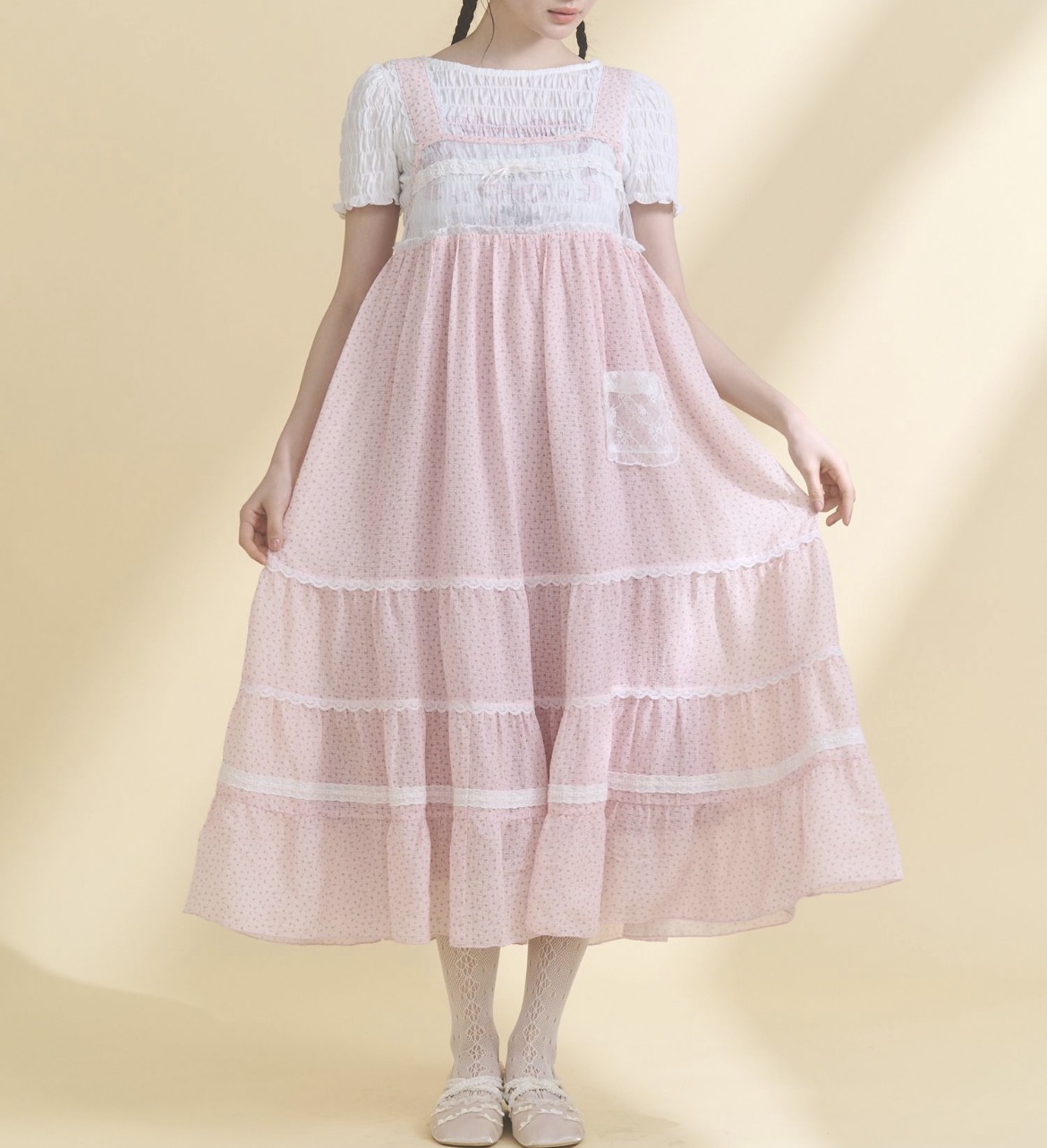 シアー感のあるレースと、軽やかな小花柄のシフォンをドッキングしたレイヤードワンピース。