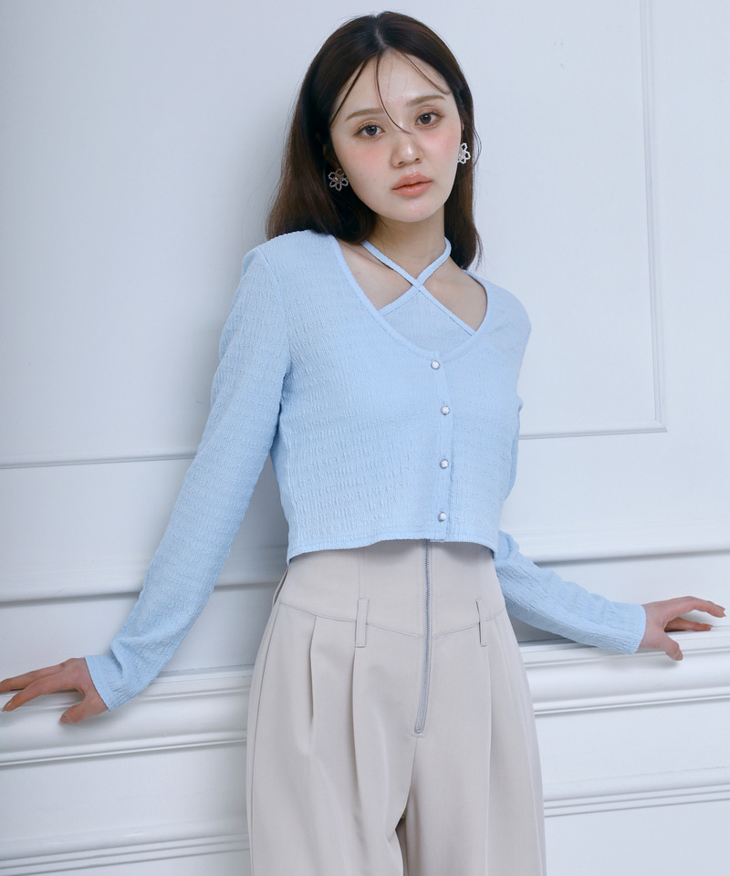 ぽこぽことした表面感のある生地で仕上げたVネックカーディガン×ホルターネックキャミのアンサンブル。