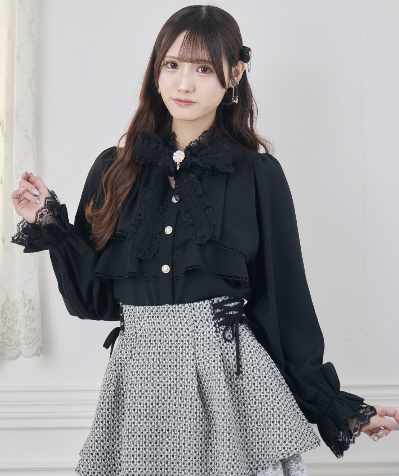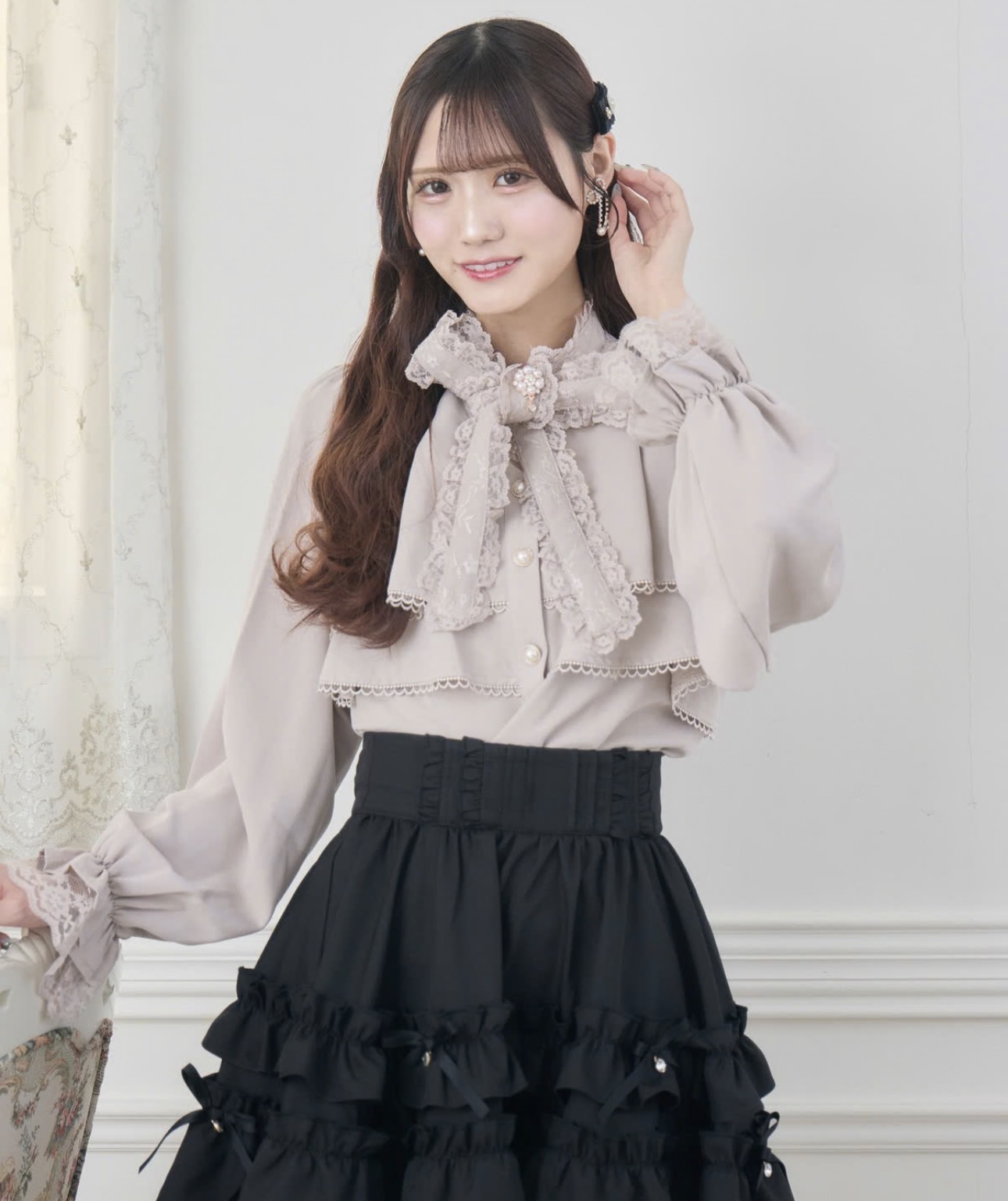 ふんわりとした2段ティアードが可愛らしいブラウス♡ヘムラインにはピコレースをあしらい、繊細で上品な印象に。細身でスッキリとしたボウタイリボンにはレースを重ね、華やかさをプラス。鎖骨の中心は控えめなVカットで、抜け感のある女性らしい雰囲気を演出します。