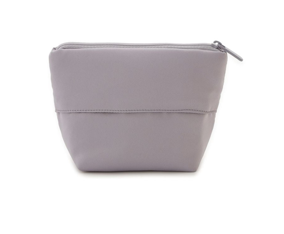 定番の台形シルエットの小さなファスナーポーチで、背面にティッシュケースが付いています。