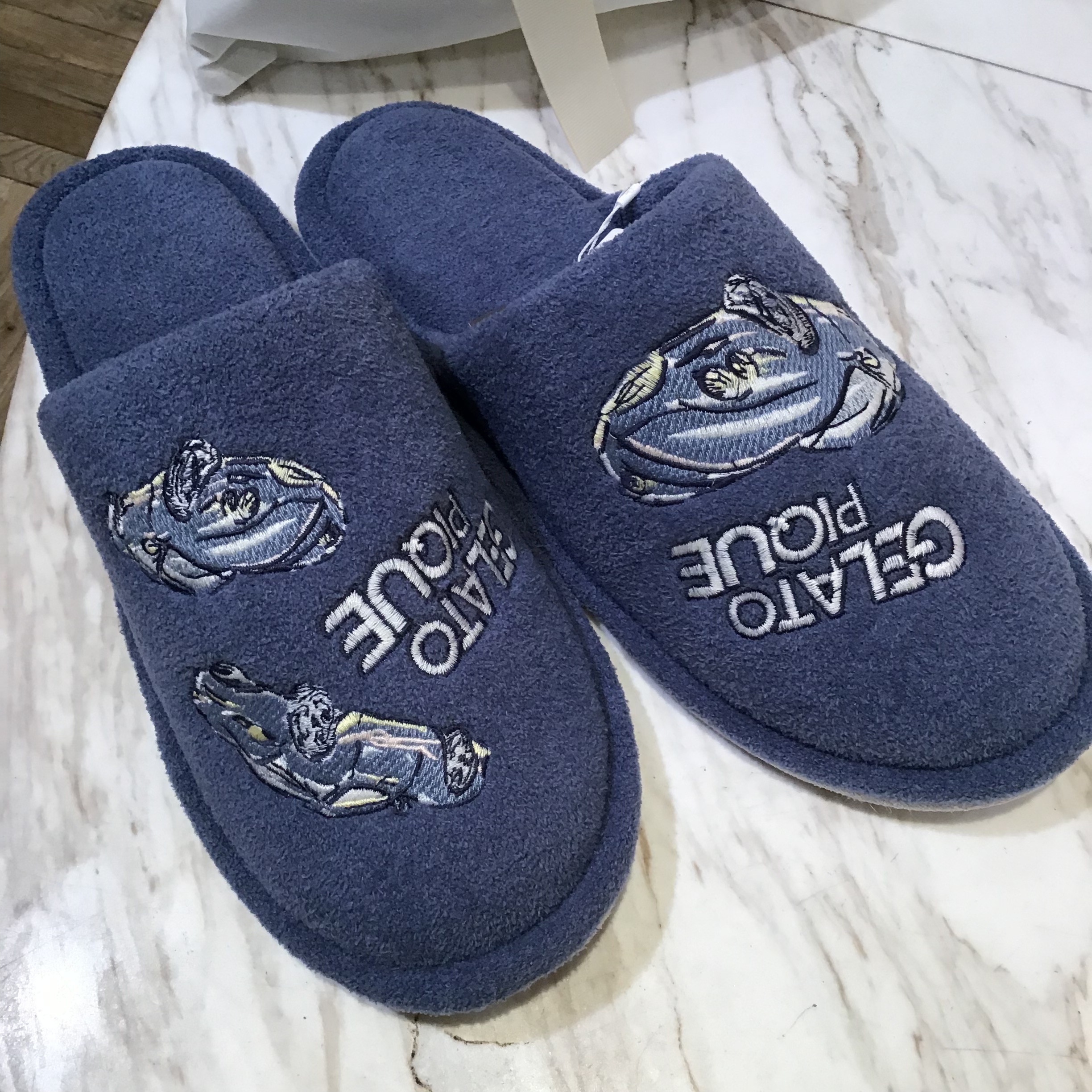 薄手で柔らかい‘エアモコ’でふっくらと足元を包むルームシューズ。車とロゴの刺繍柄を左右アシンメトリーに入れて、動きのあるデザインに仕上げました。