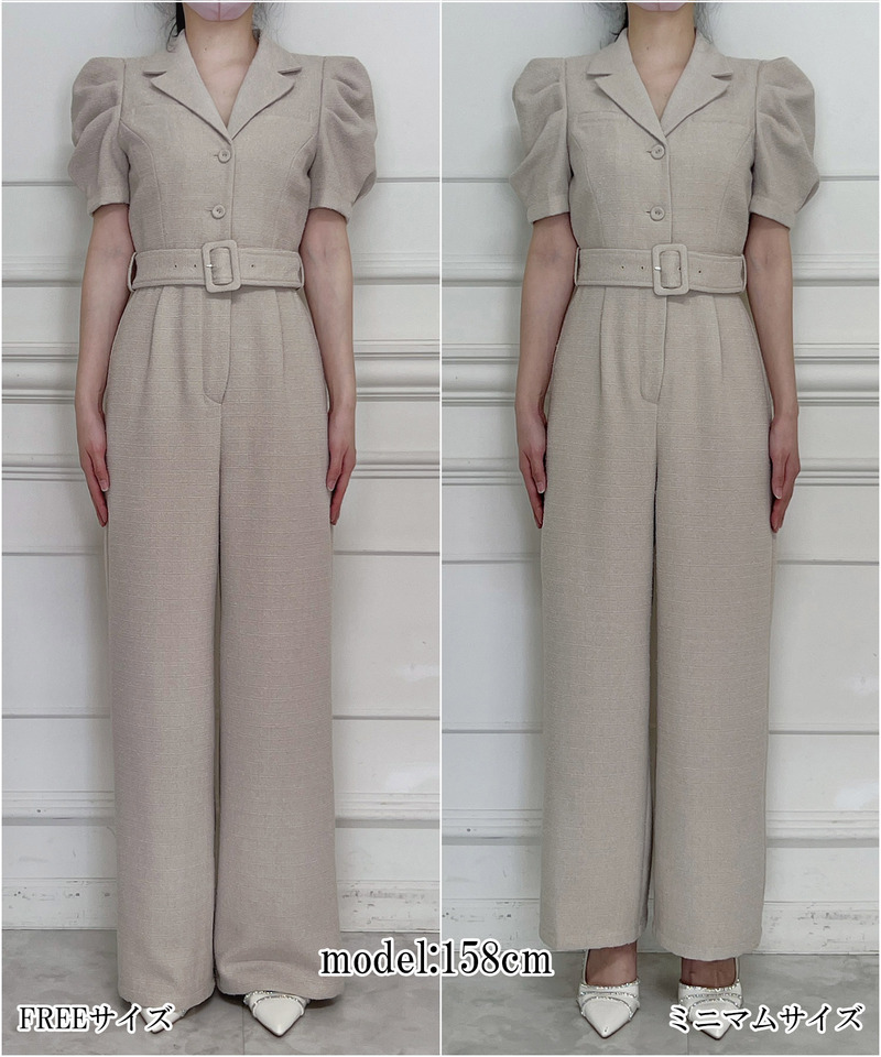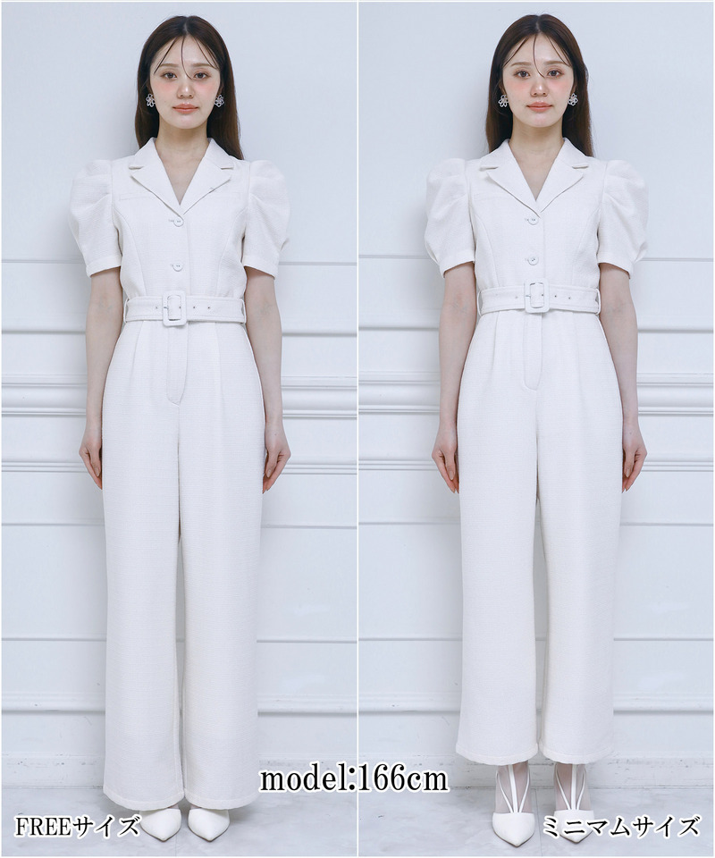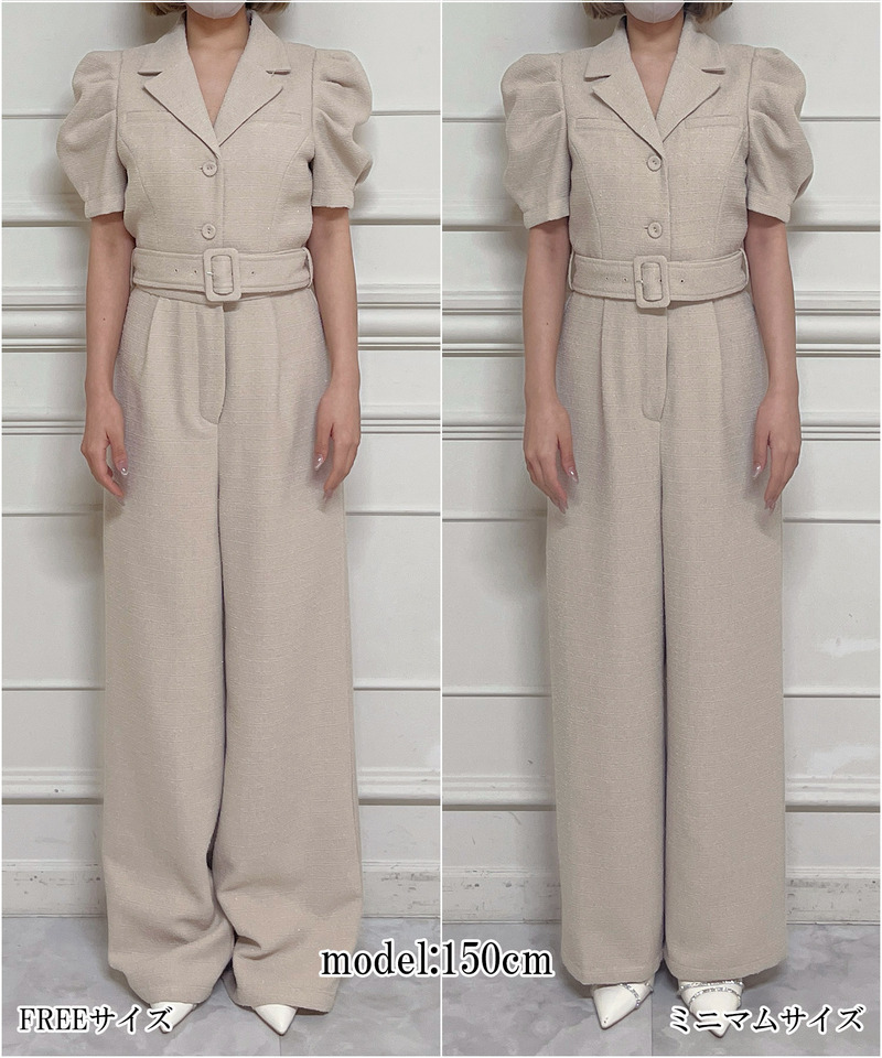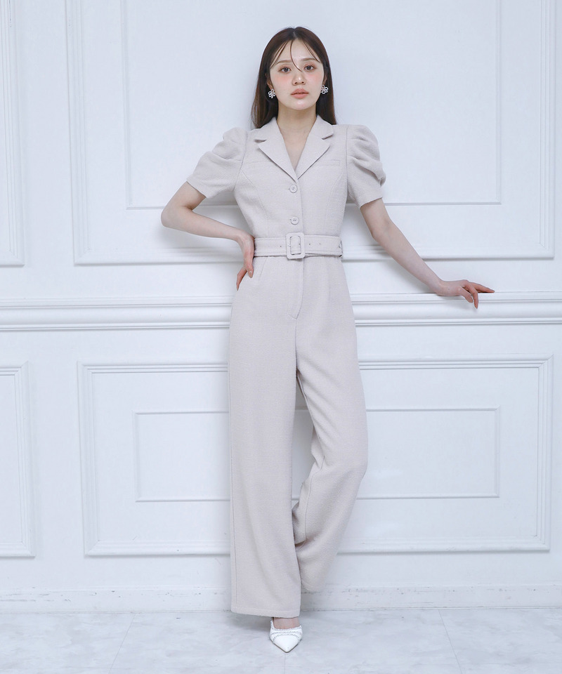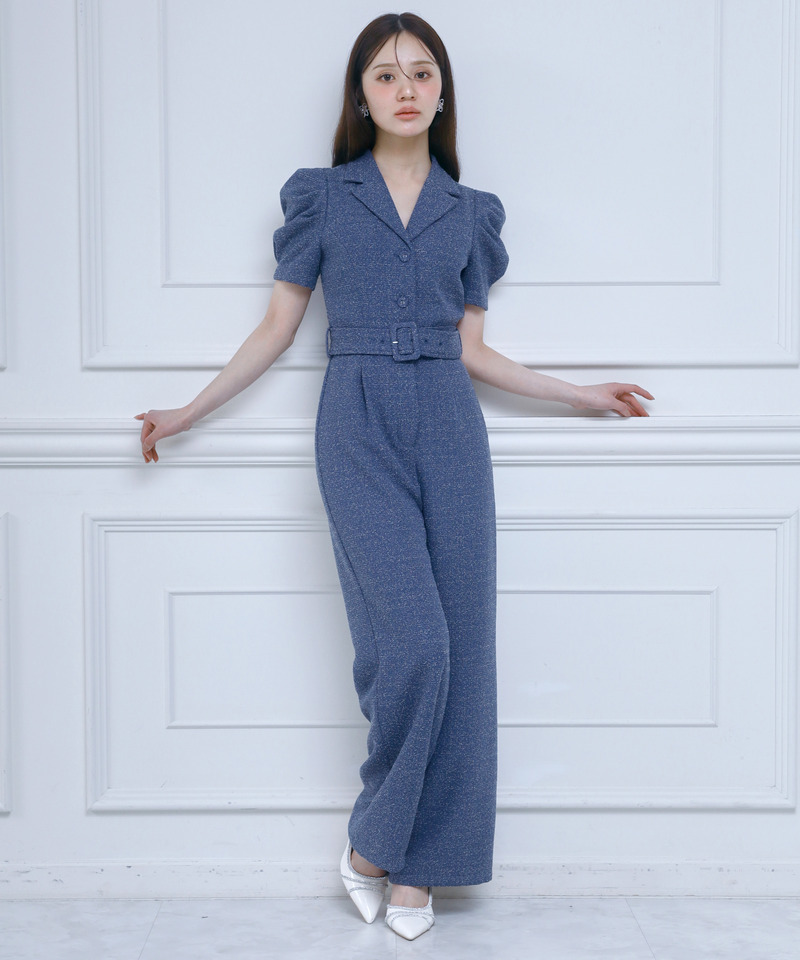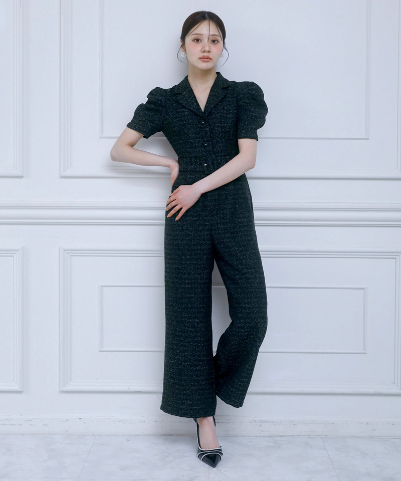 上品に煌めくラメツイードを使用したパフスリーブテーラーオールインワン。