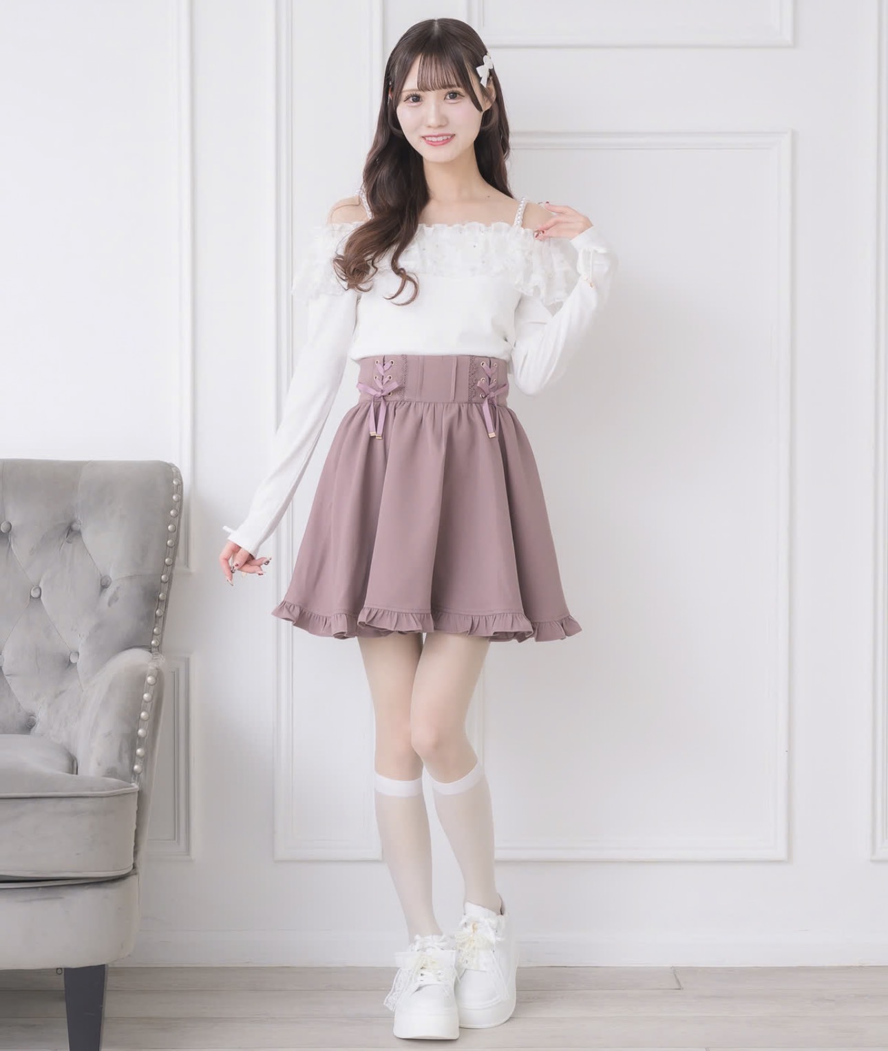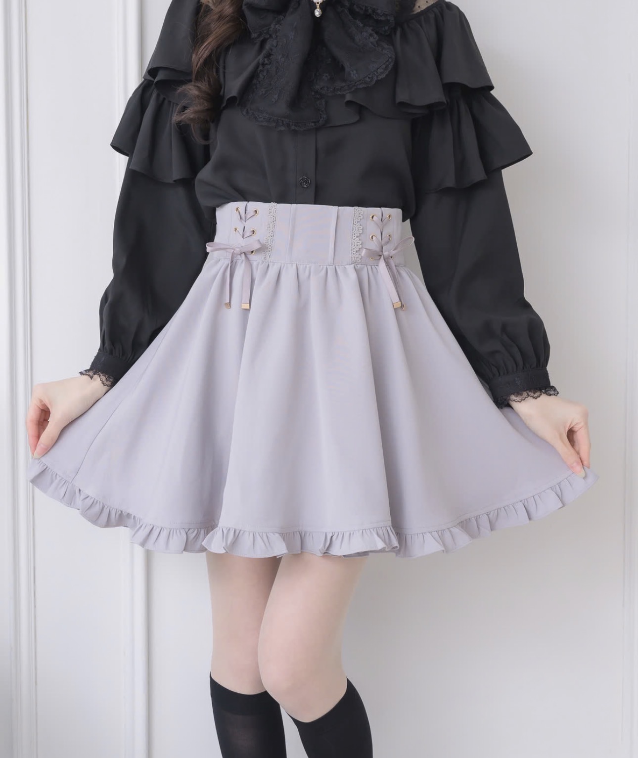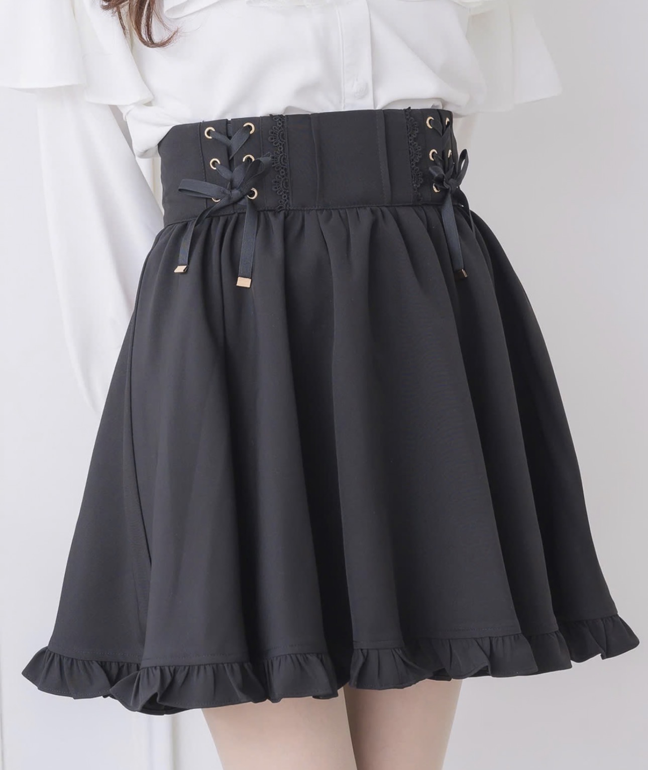 シンプルなワンカラーでコーディネートしやすく、程よい丈感がさりげなく脚を引き立てる一枚。フロントのレースアップが視線を集め、さりげないアクセントとしてスタイリングを引き締めてくれるデザイン。フレアラインが女性らしいシルエットを作り、着こなしに華やかなニュアンスをプラス。
