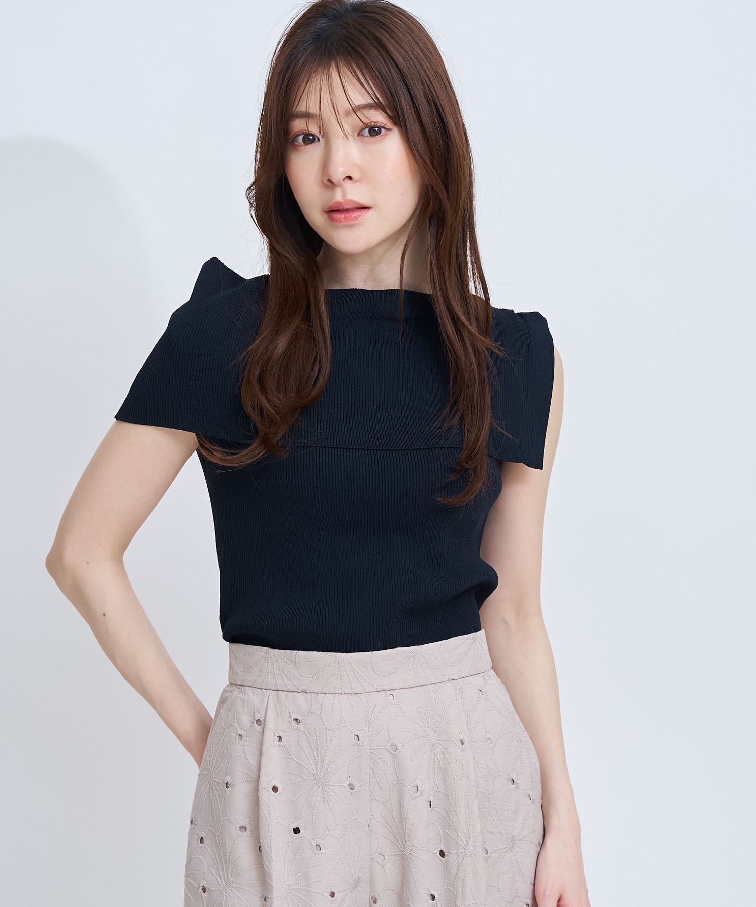 アシンメトリーなデザインが胸元に美しいドレープを生み、さりげなく華やかな印象に。