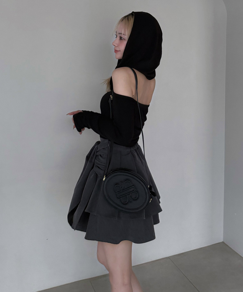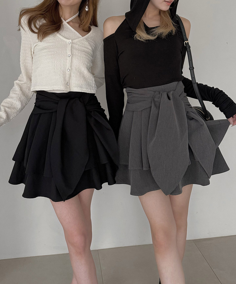 タックプリーツを施すことで表情豊かなラッフルを表現したティアードミニスカート。