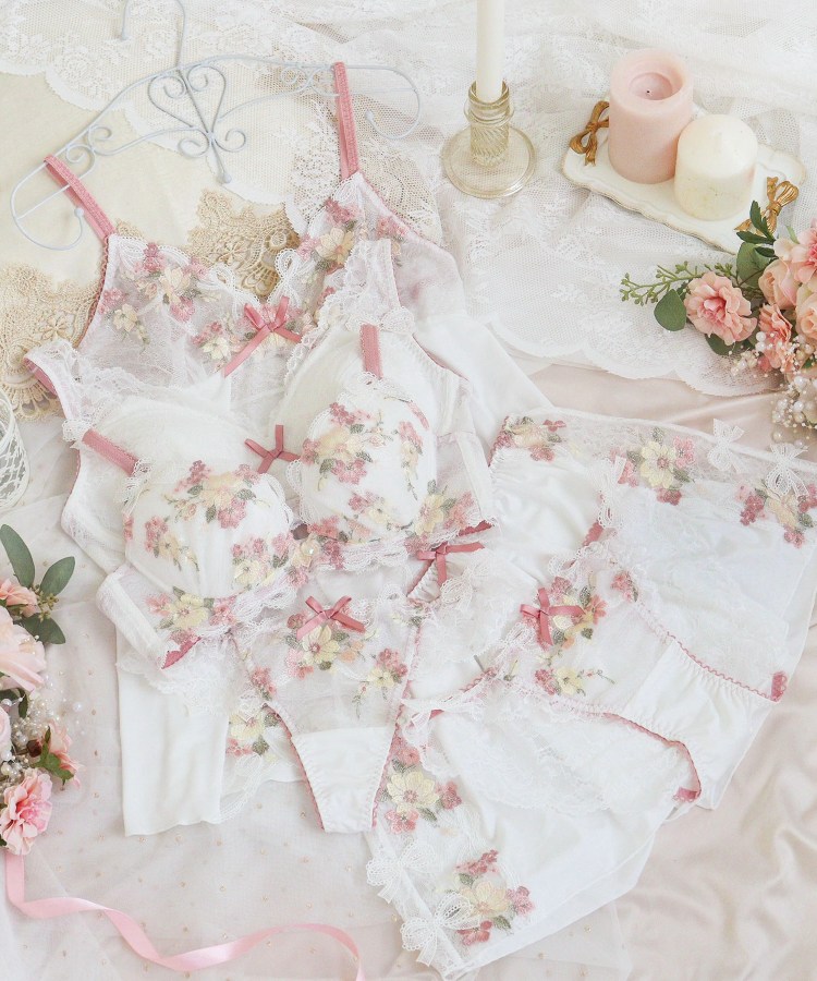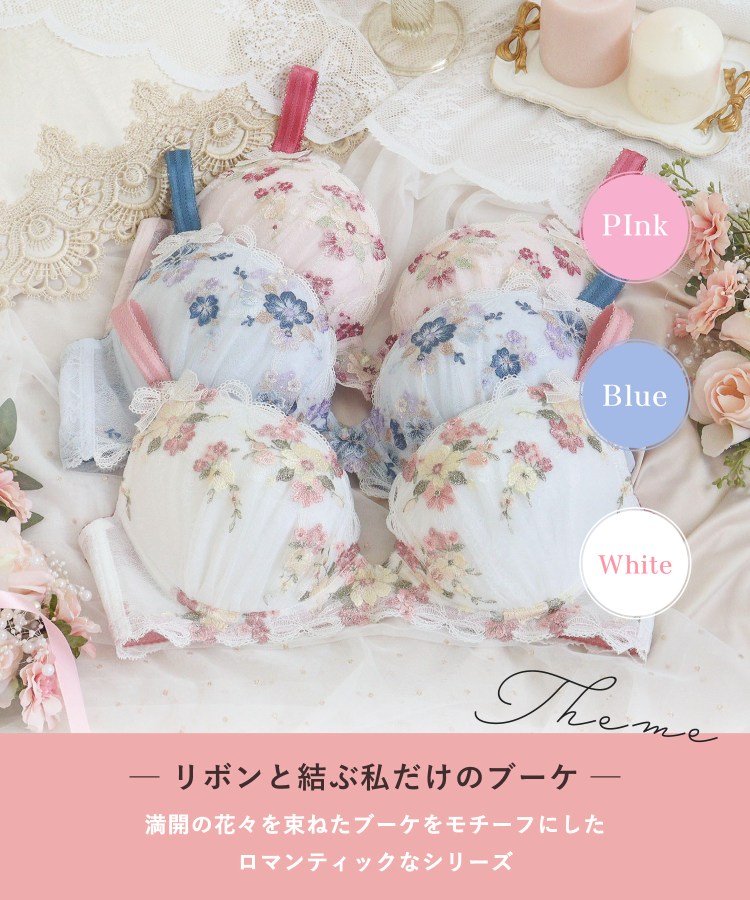 満開の花々を束ねたブーケをモチーフにした、ロマンティックなシリーズです。高級感のあるラッセルレースをフロント部分にあしらい、他にはない特別感を演出しました。色とりどりのお花は、ラメ糸を刺繍して上品な輝きに。クラシカルな「トーションレース」をモチーフに現代風にアレンジし、スカラップをリボン柄で表現することで、繊細ながらも大人の可愛らしさを演出しました。身生地にあしらったリボンアップリケも、見逃せないワンポイントに。バックスタイルはアシンメトリーに切り替えました。細部にまでこだわり抜いた装飾が、見ているだけで心をときめかせてくれる豪華なコレクションです。