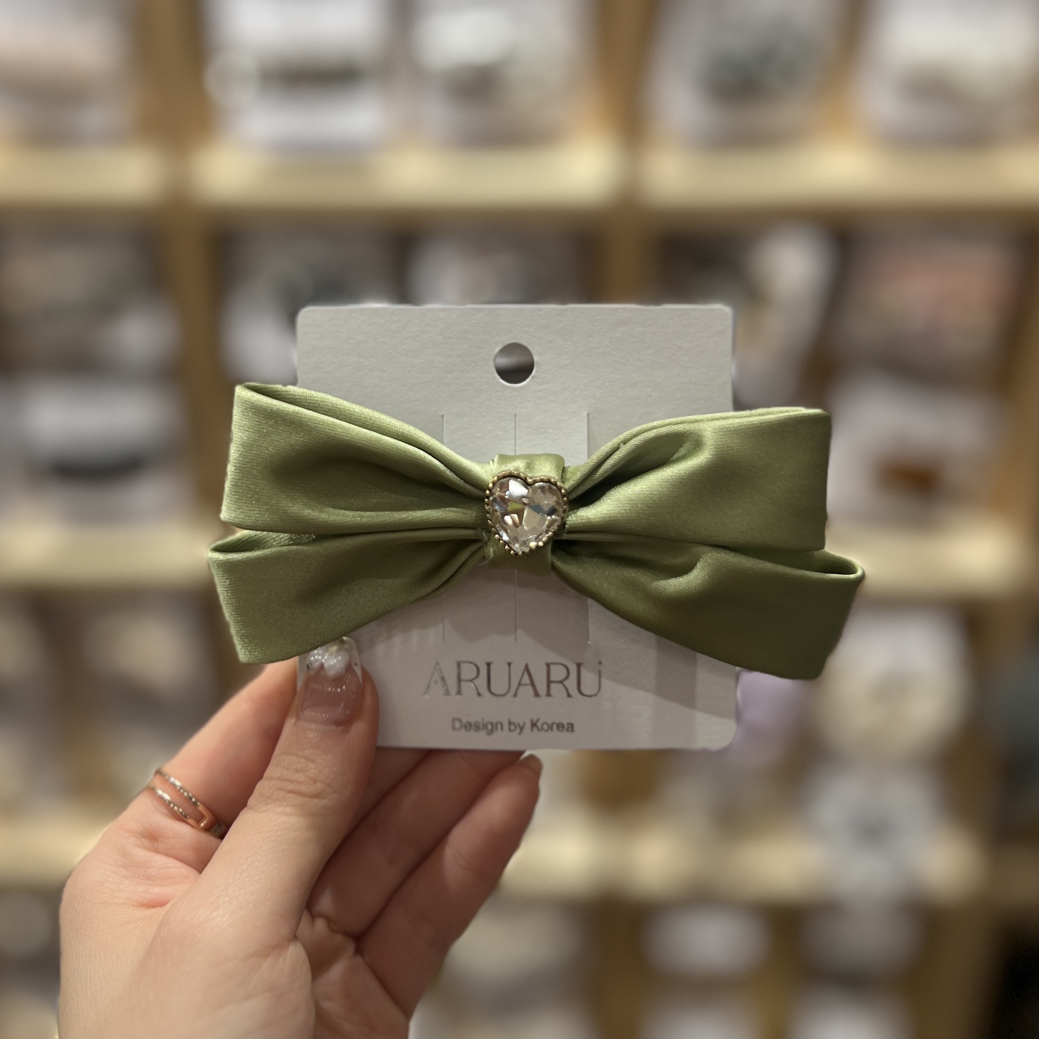 サテン調の生地を使用した大きなリボンに、中央のキラキラとしたハートビジューがポイントのヘアピン💖