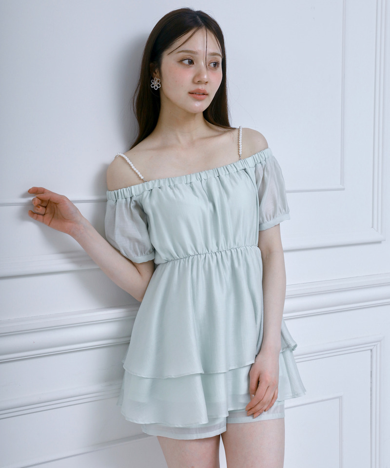 ふんわりと上品に揺れるティアードラッフルディテールやパールストラップデザインがスタイリングに存在感をもたらします。