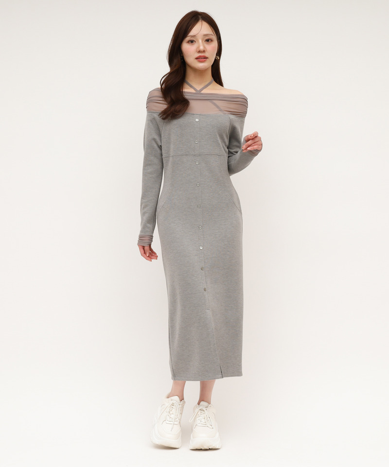 デコルテ部分にはチュール素材のシアー切り替えを施し、控えめながらも女性らしい色気をプラス。