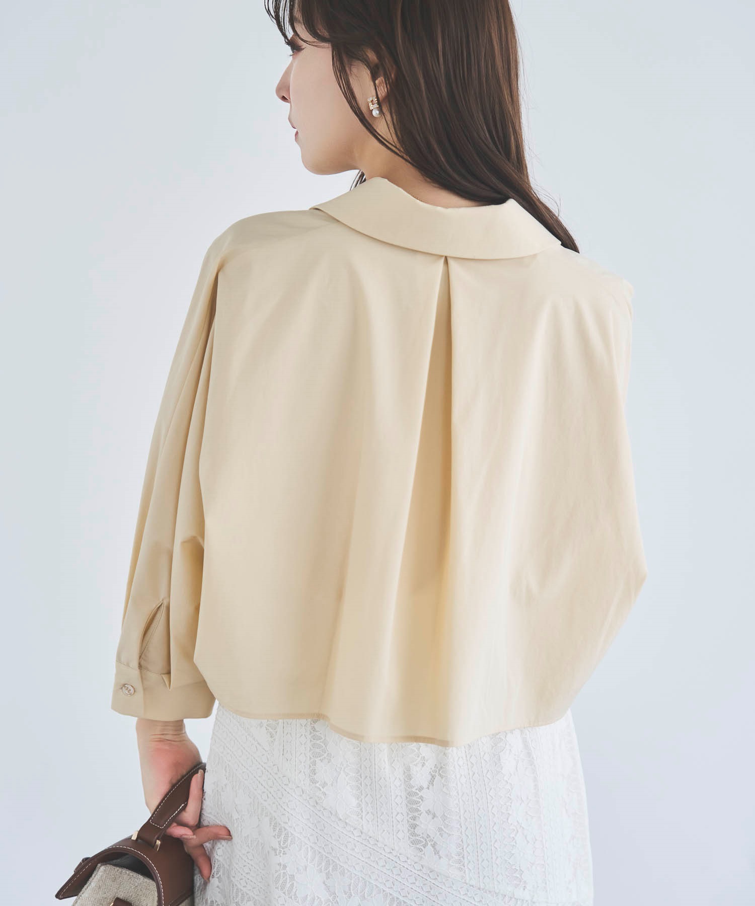 前身頃に重ね着風のディテールを施し、シンプルながらも奥行きのあるスタイリングを演出します。