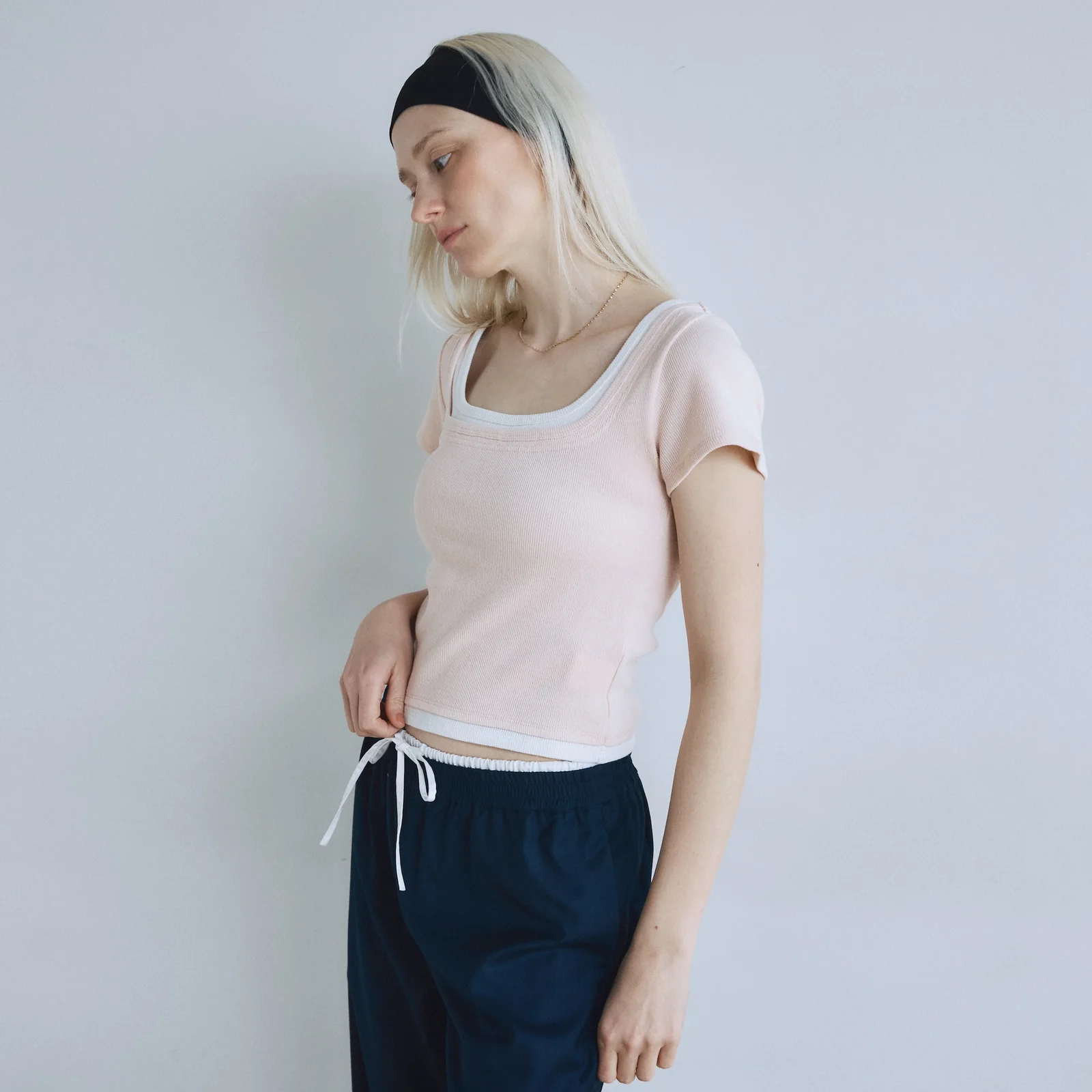 パンツのボリュームを活かすなら、〈C/L FluffyレイヤードライクTシャツ〉などのコンパクトなトップスをインしたメリハリのあるスタイリングがおすすめ。