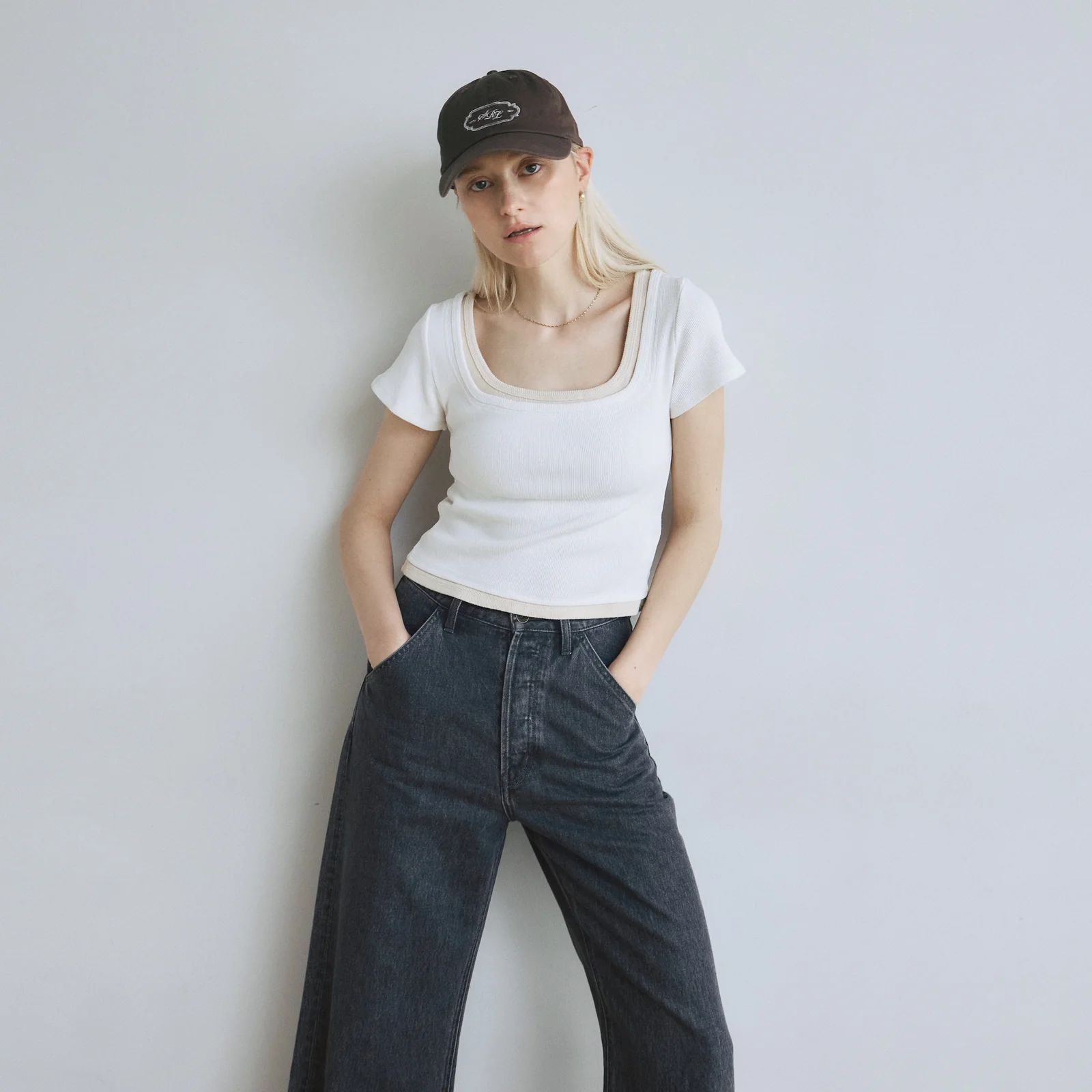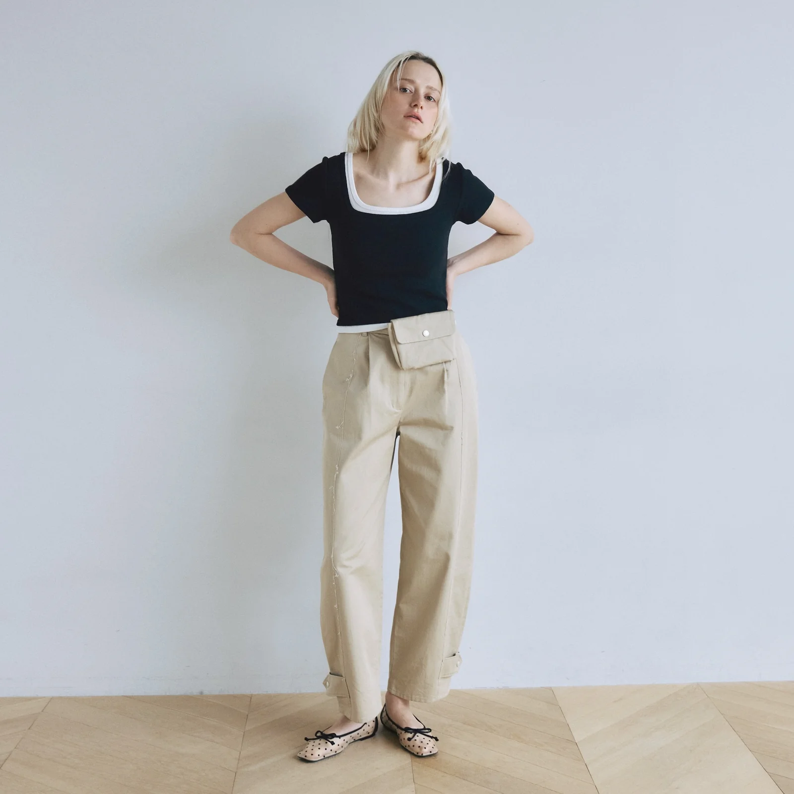 コンパクトな丈感を活かし、〈Organic cottonベーシック SRN02〉などのハイウエストデニムやワイドパンツと合わせたカジュアルスタイルがおすすめ。