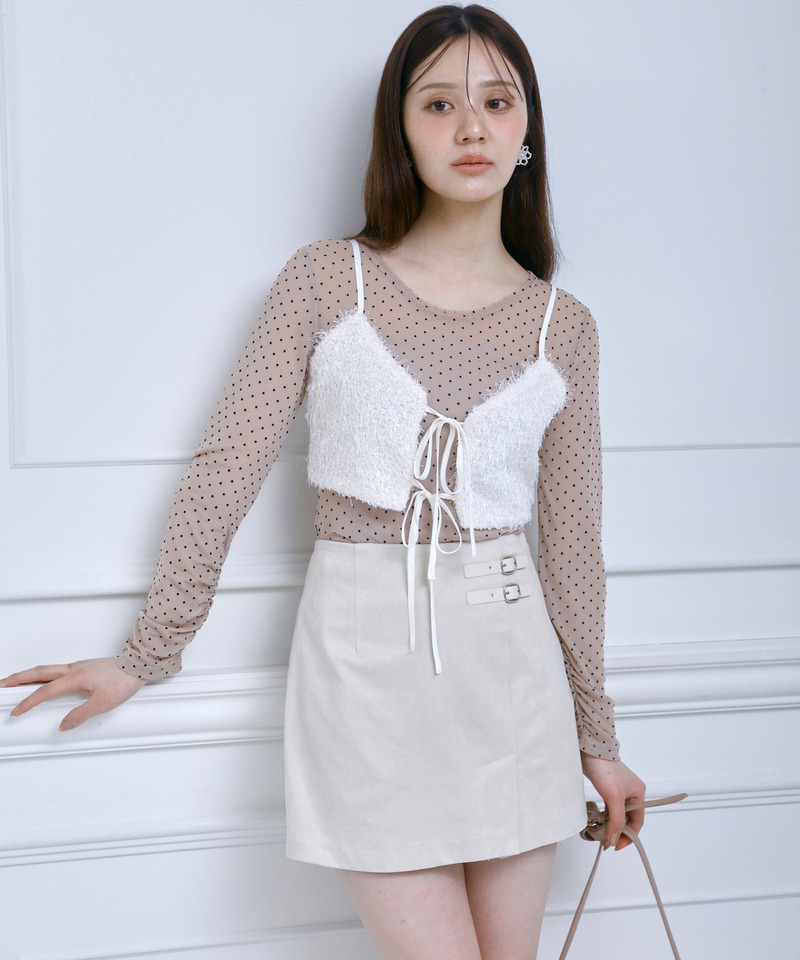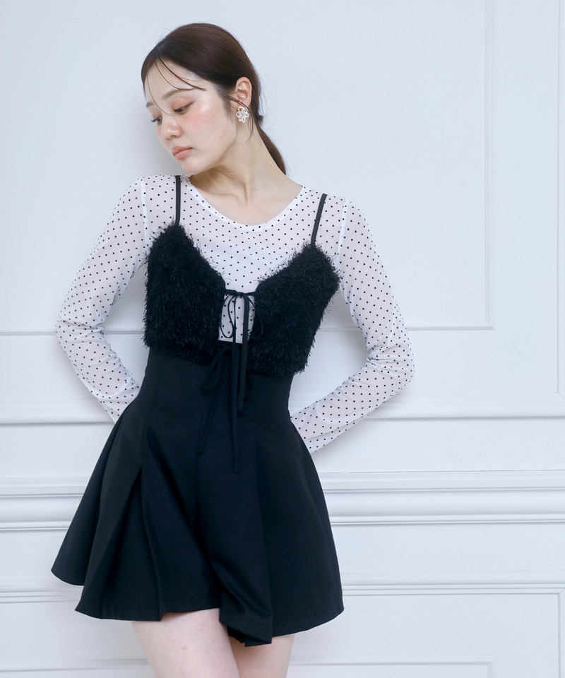 シーズンムード高まるドットチュールギャザースリーブトップス×表面感のあるリボン付きビスチェの主役級アンサンブル。