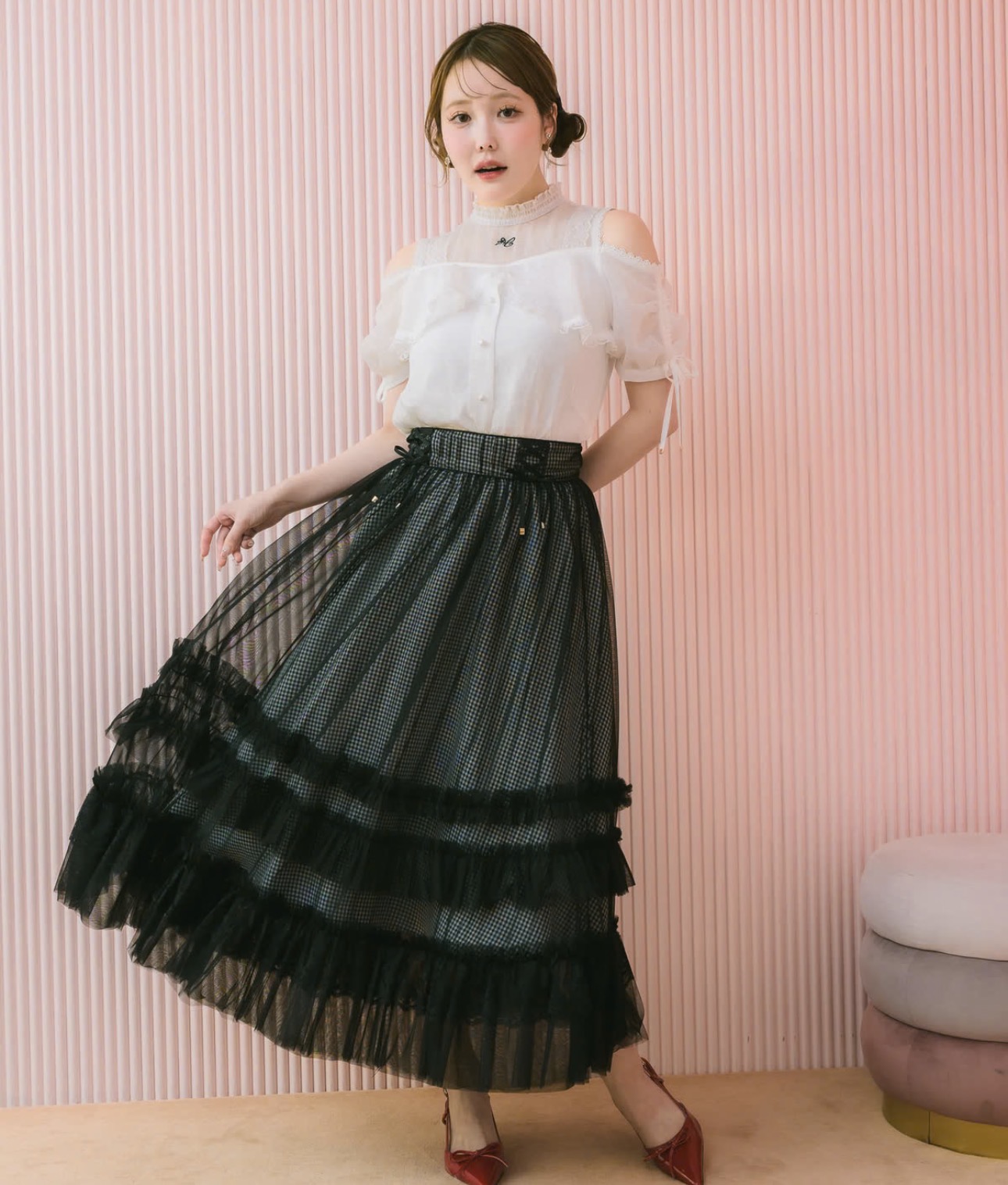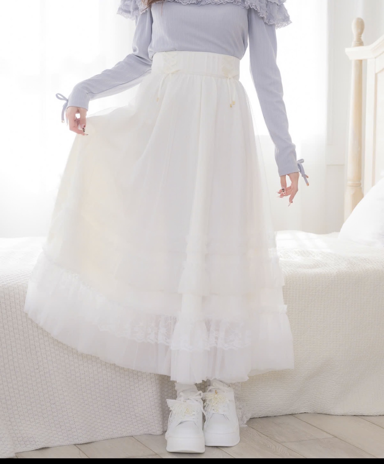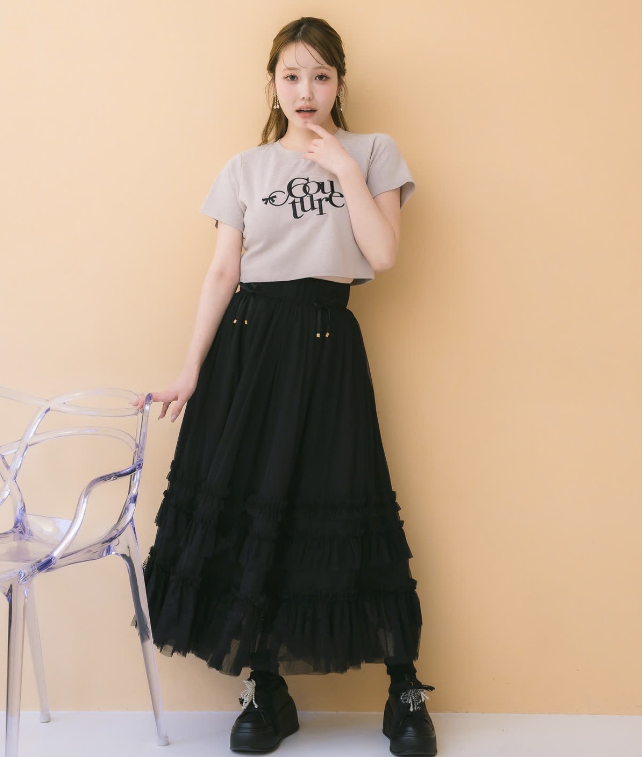 ふんわりと軽やかなチュールが揺れる、ロマンティックなロングスカート。中のスカートを短めに仕上げることで、チュールの透け感を引き立て、抜け感のある印象に♪ウエストにはレースアップデザインを施し、スタイリングにさりげないアクセントをプラスします。