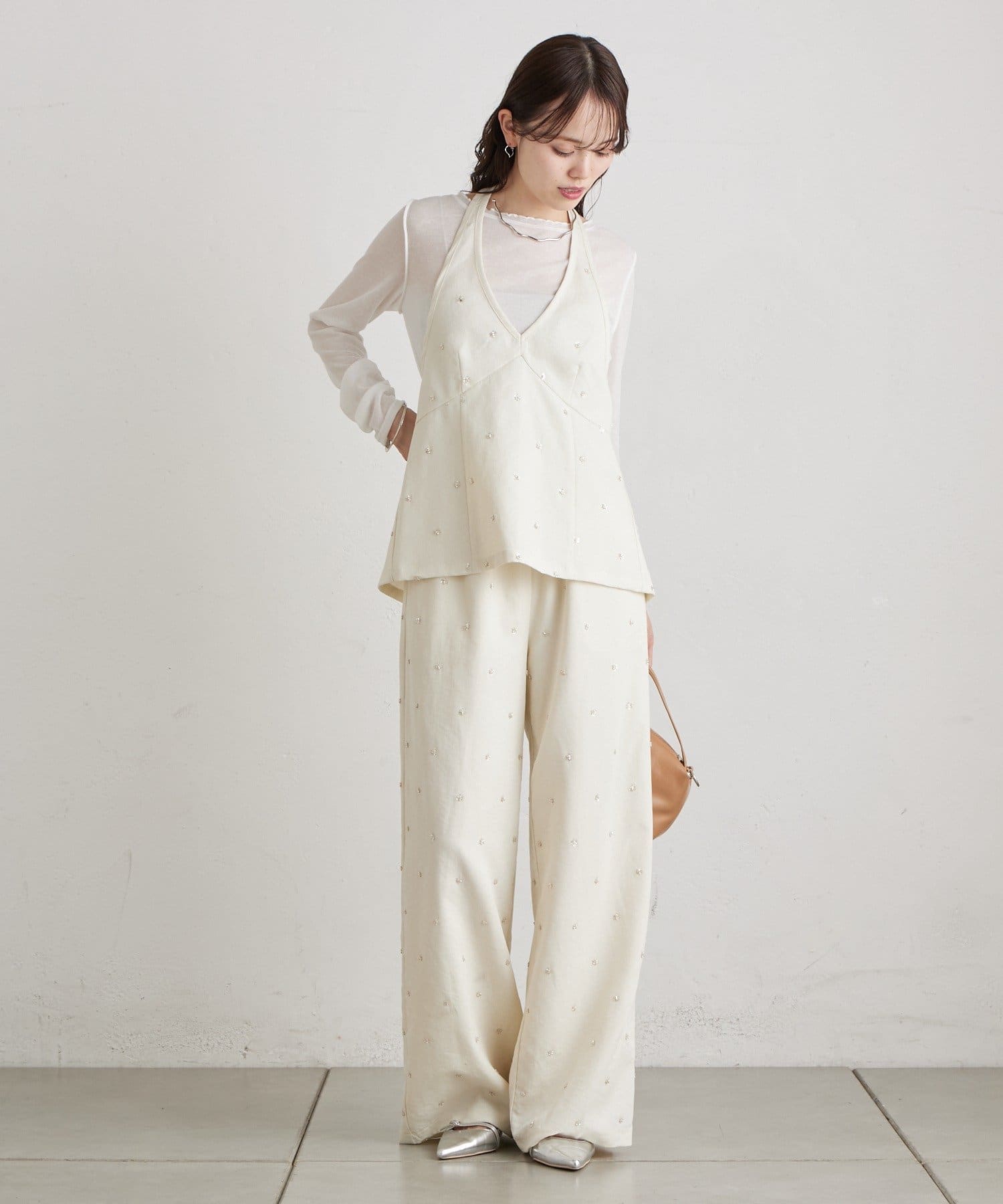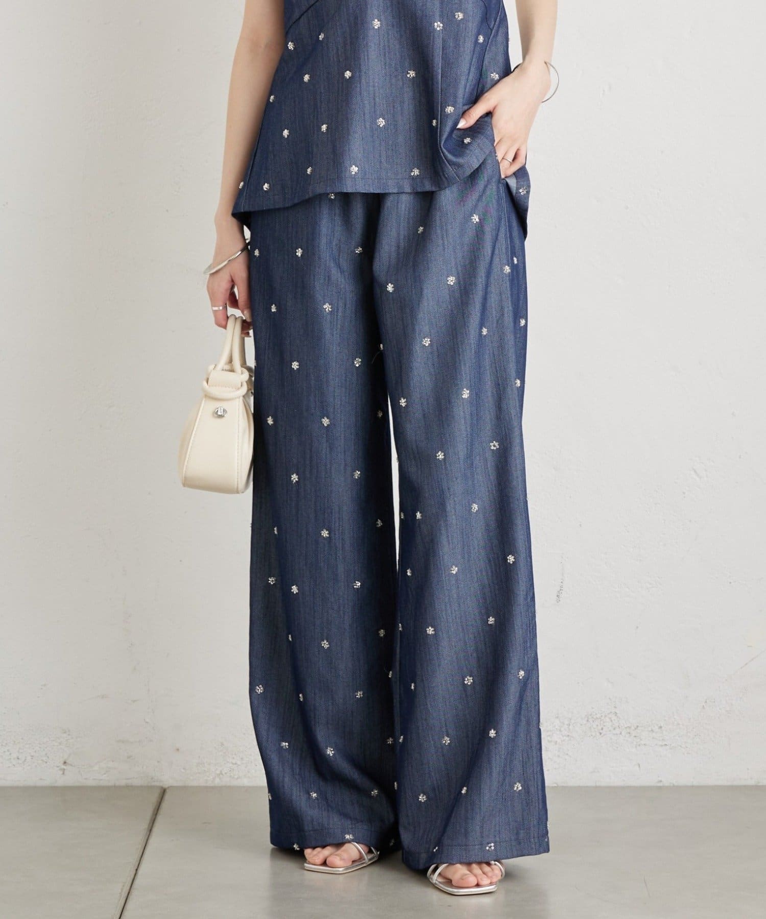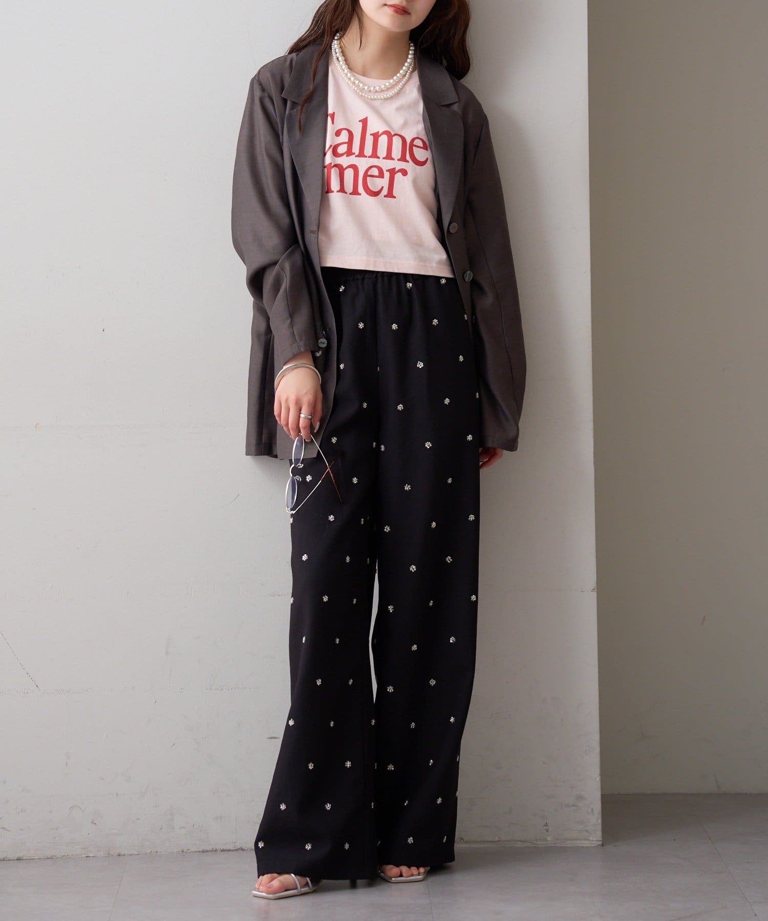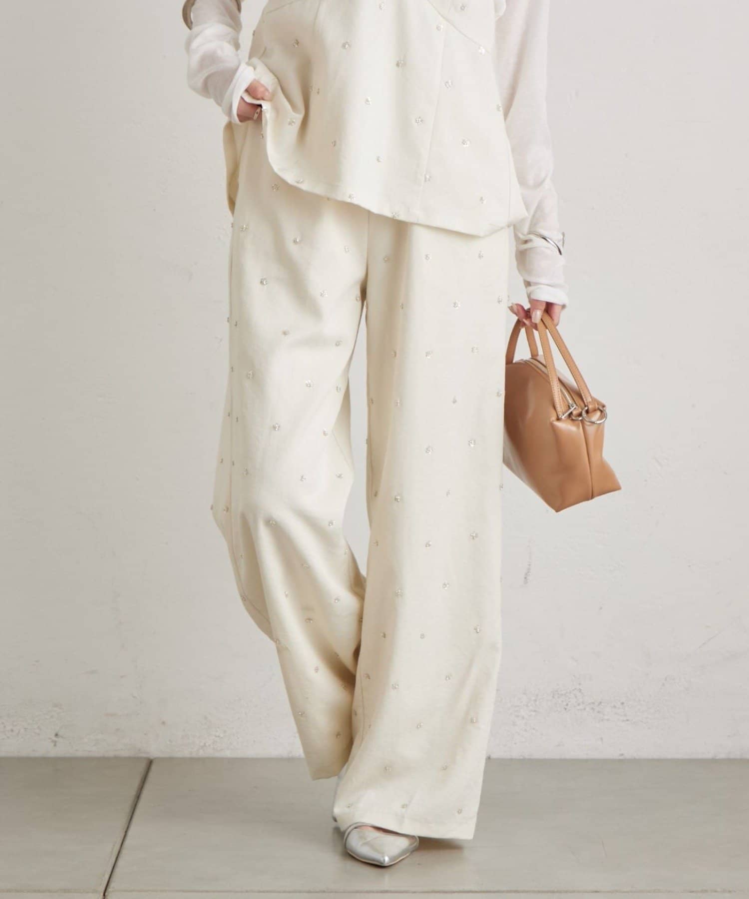 ツヤ感は控えめな素材感に繊細なビジューを散りばめたデザインで、カジュアルながらも上品な印象のスラックス。