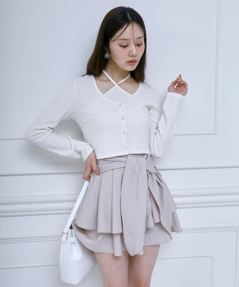 タックプリーツを施すことで表情豊かなラッフルを表現したティアードミニスカート。