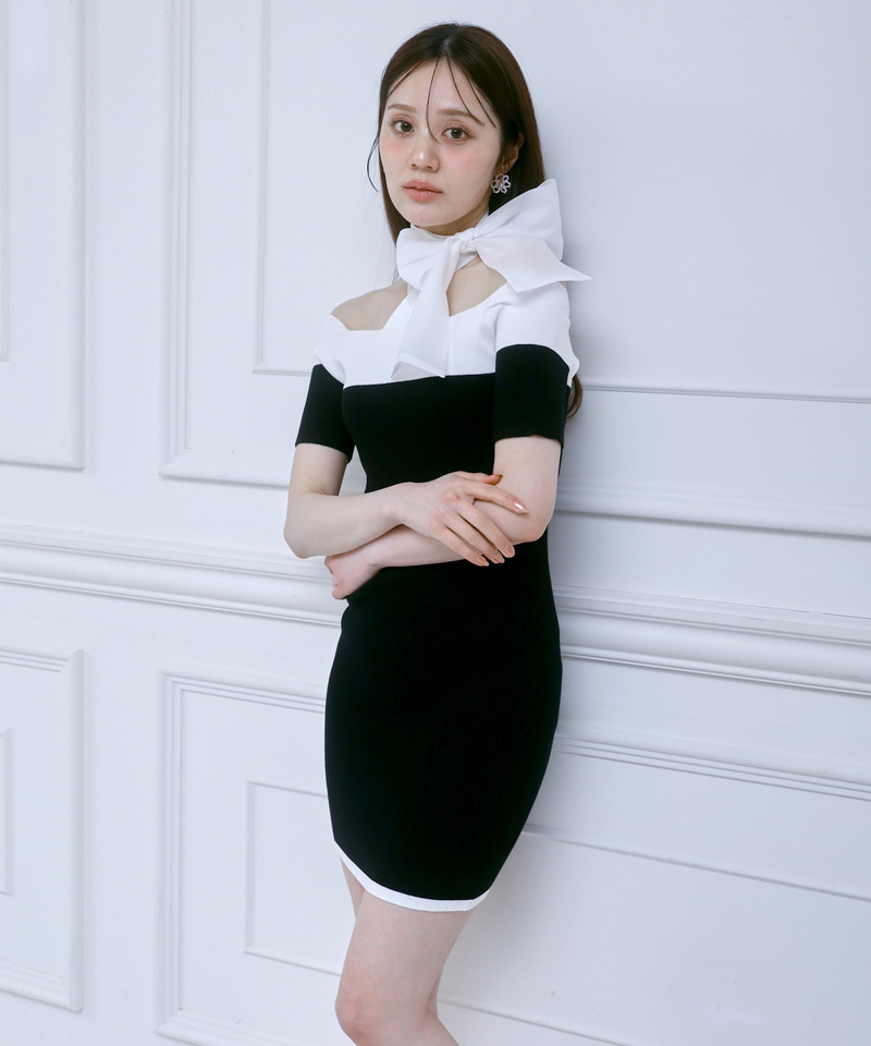 上端と裾部分に施された配色ラインがメリハリを演出し、身体のラインを綺麗に魅せるタイトシルエットが魅力のミニワンピース。