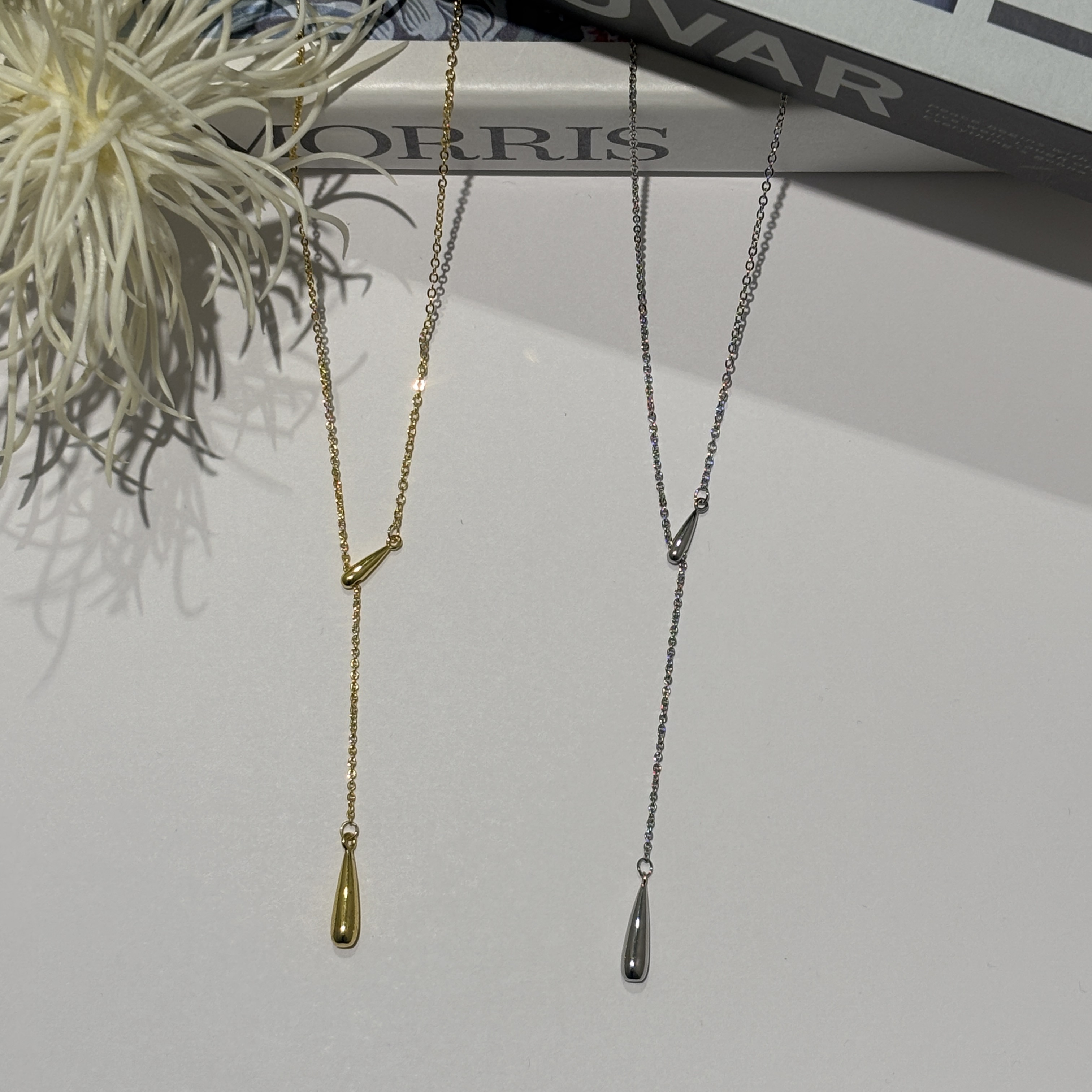 細めのチェーンについた雫型のチャームが女性らしい印象に✨