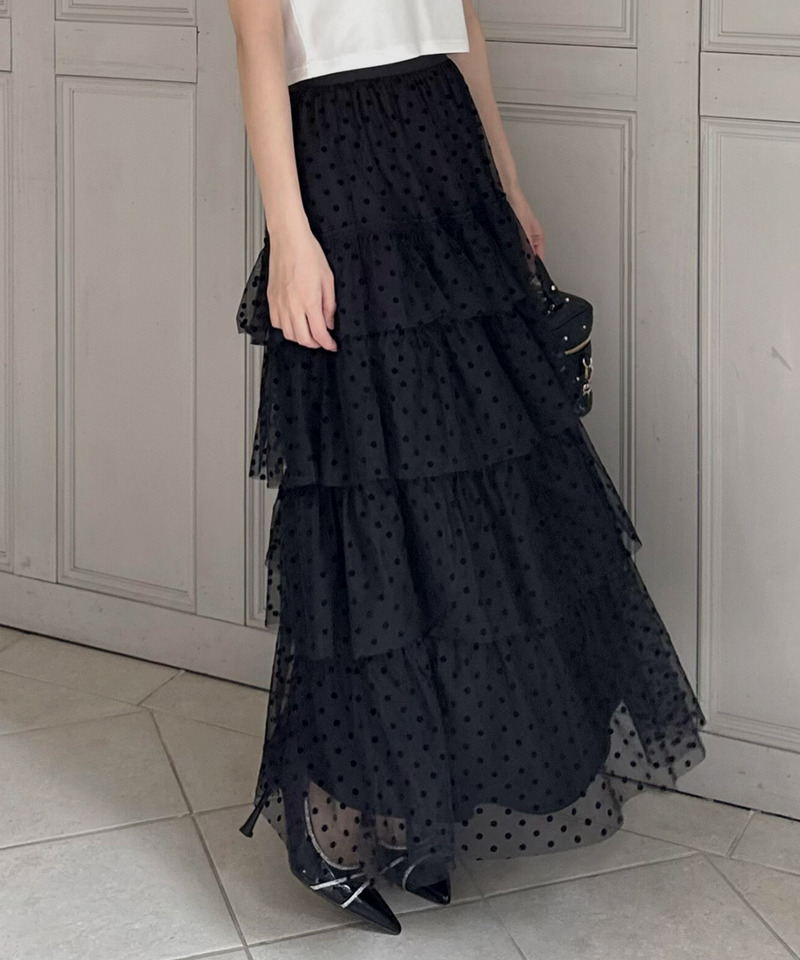 存在感抜群のフロッキードットチュール生地を使用したティアードラッフルスカート。