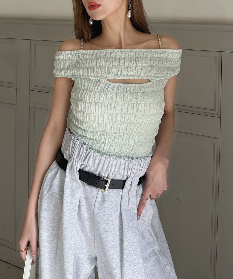 女性らしさを引き立てる華やかなオフショルダートップス。