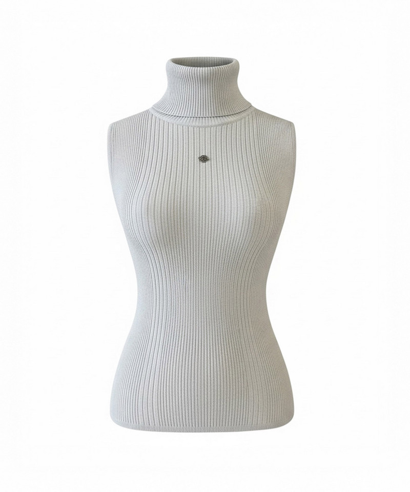 胸元のバラ型プレートが目を惹く、ノースリーブのタートルネックニット。