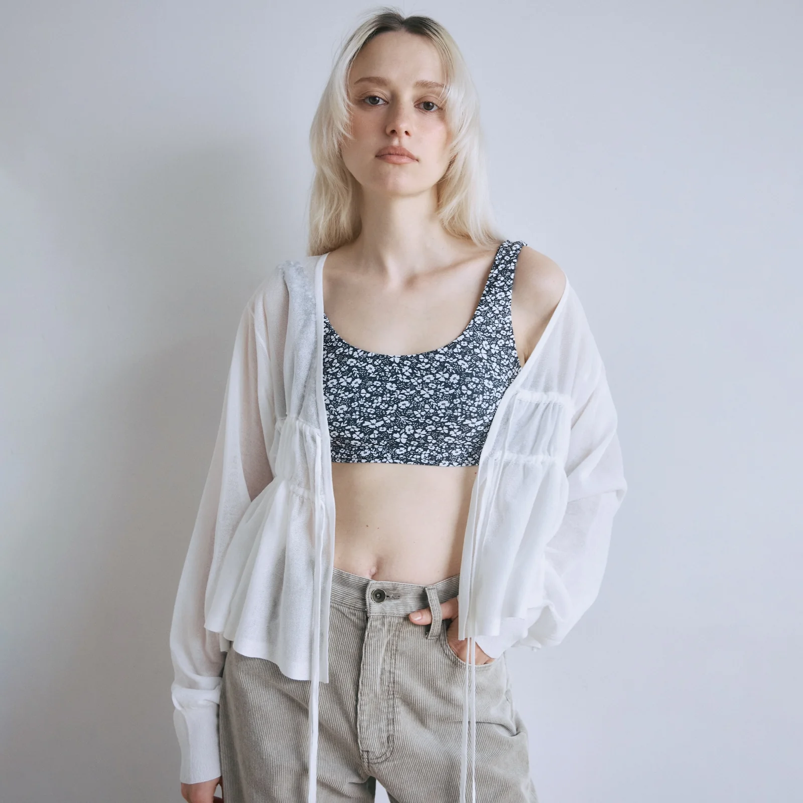 空気を含んだようなエアリーなシアー素材にフロントのシャーリングとリボンで遊び心を添えた主役級カーディガン。