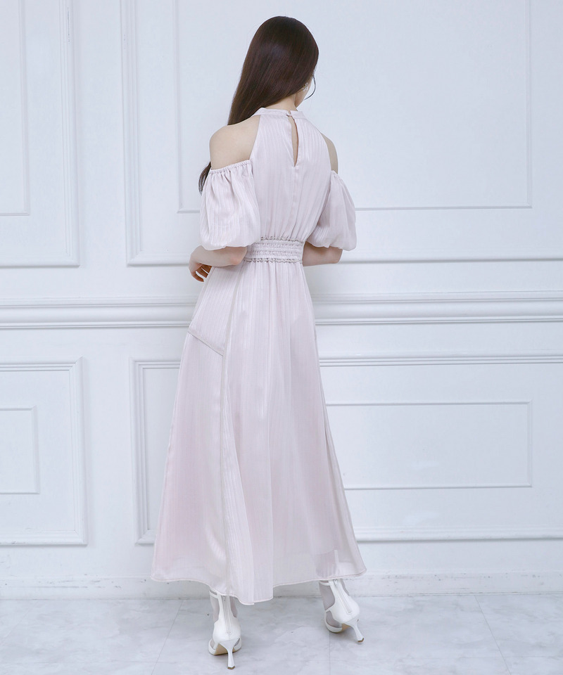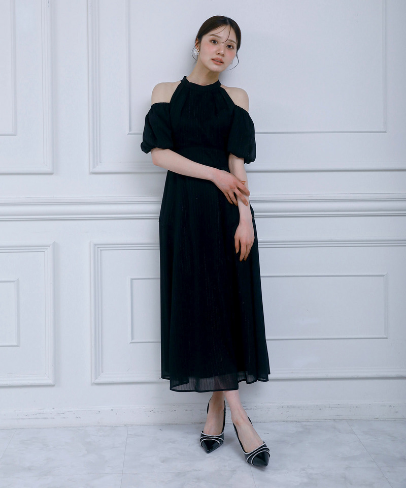 上品に煌めくラメストライプシアー生地を使用したコールドショルダーロングワンピース。