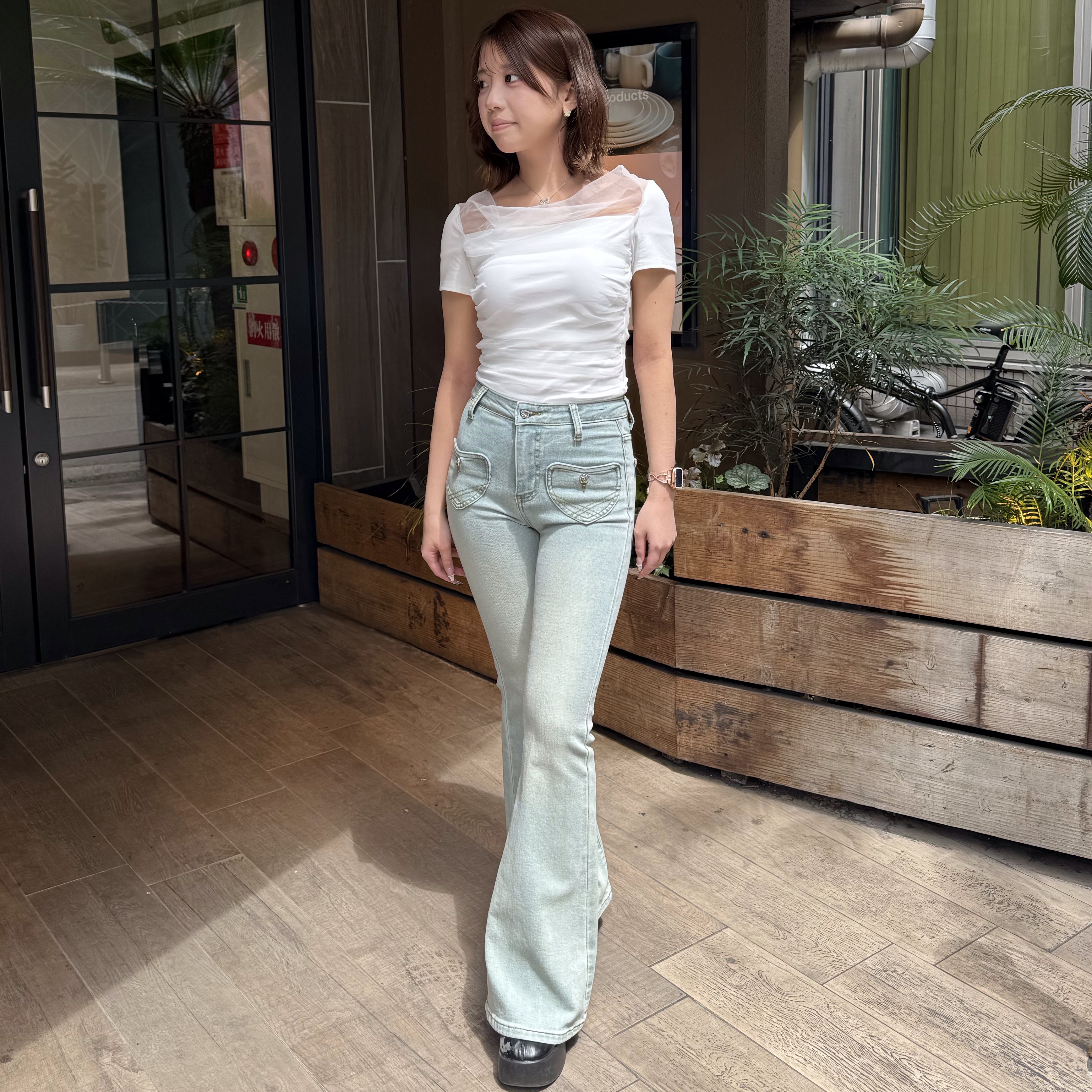 デニムやショートパンツ合わせだと綺麗目カジュアルに、スカートと合わせるとフェミニンに◎