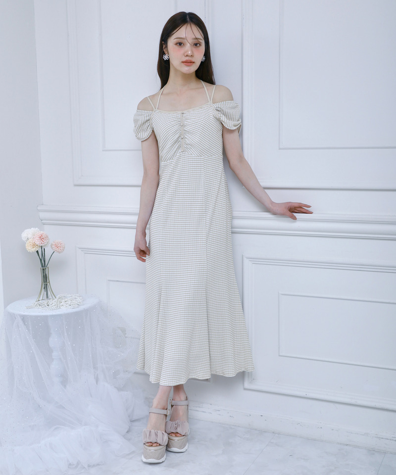 程良い表面感のあるギンガムチェック柄を使用したレイヤード風デザインのロングワンピース。