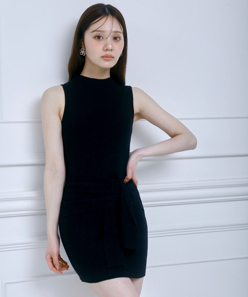 プチハイネックとノースリーブデザインで首元や肩周りをすっきり見せ、ウエストマークデザインがメリハリのあるラインを演出。