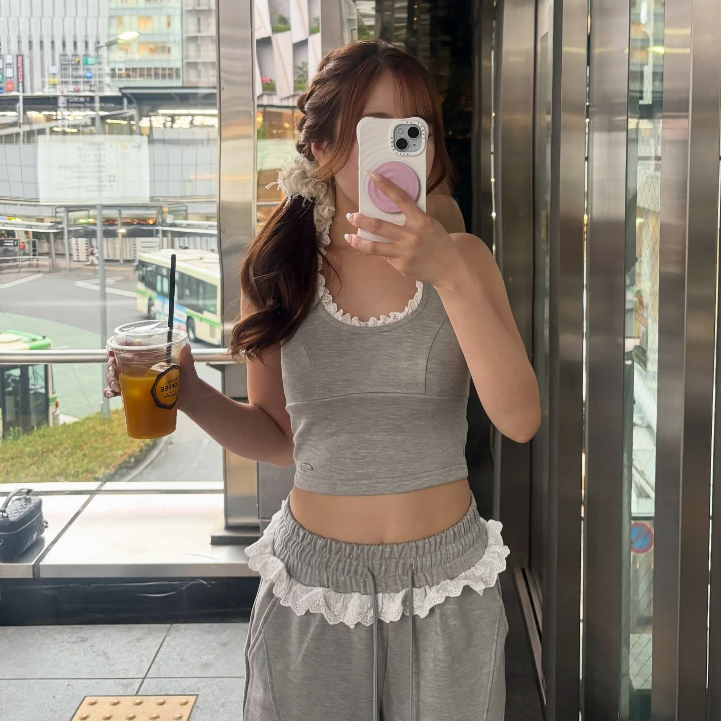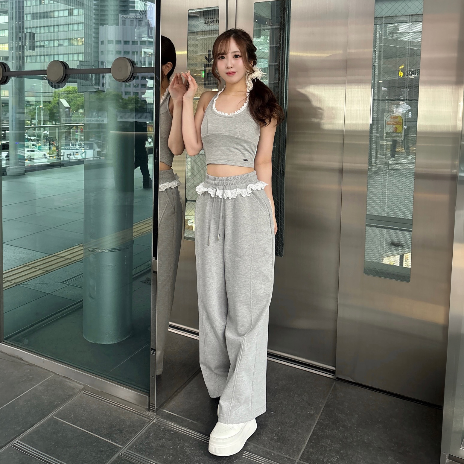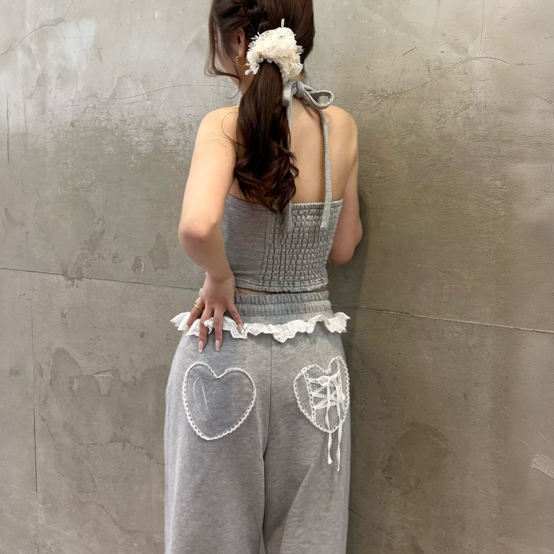 リラックス感のあるシルエットにレースやハートディテールを落とし込んだ、1枚で可愛いスウェットパンツ🩰 ウエストフリルやバックのレースアップで、どこから見てもときめく甘さをプラス🪞 コンパクトトップスからサンダル合わせまで、ラフにも女っぽくも着こなせる万能アイテムです♡